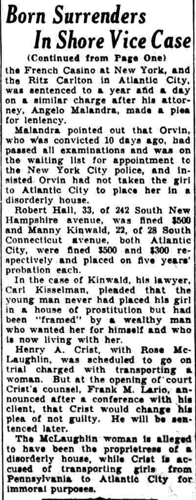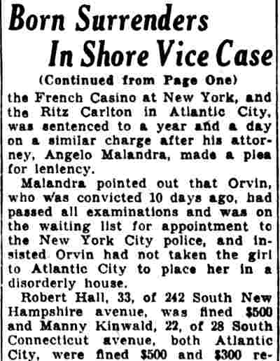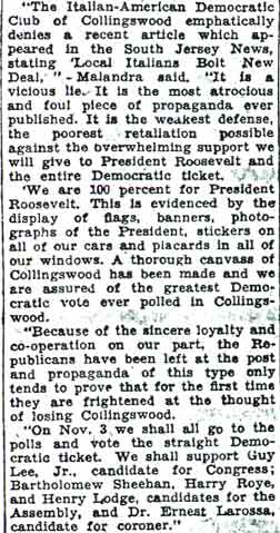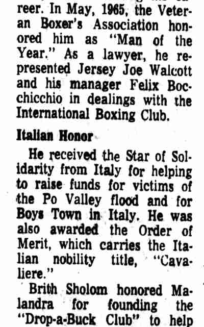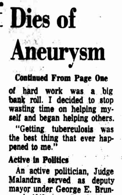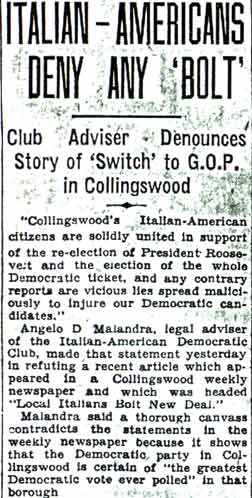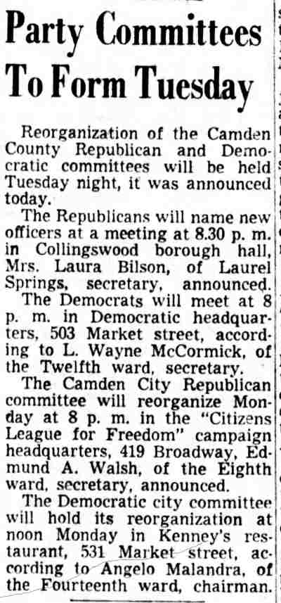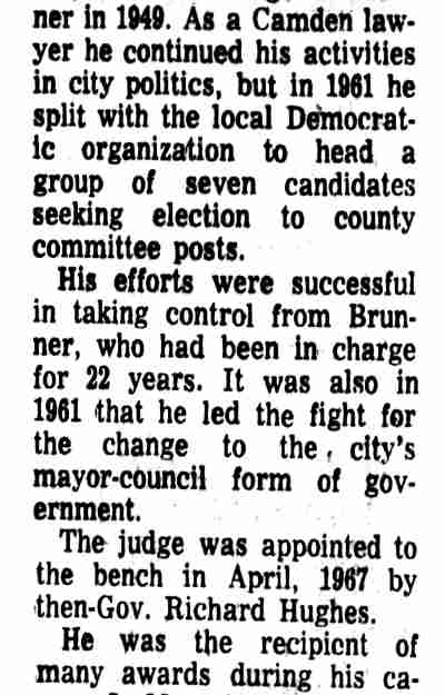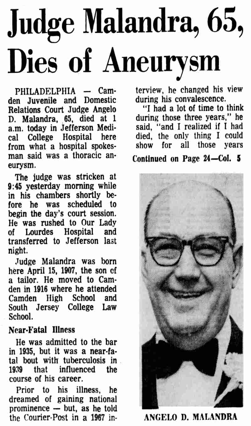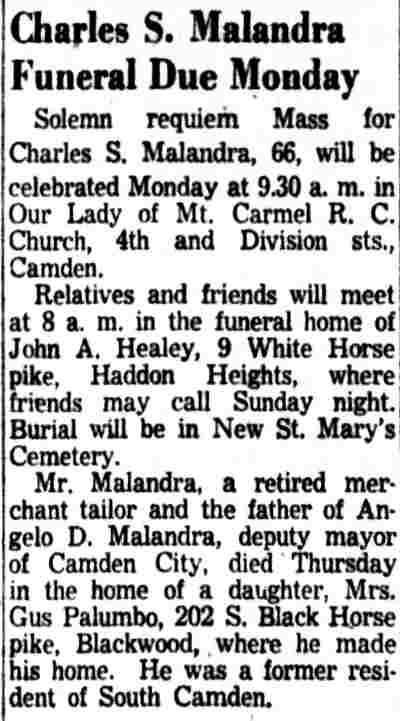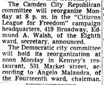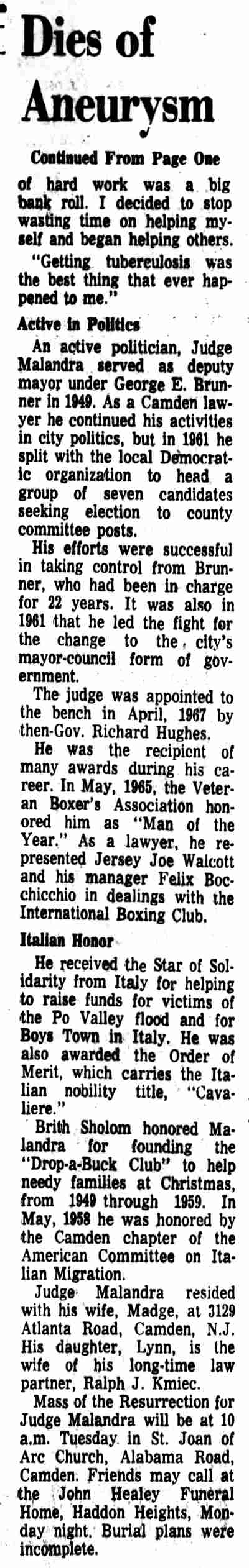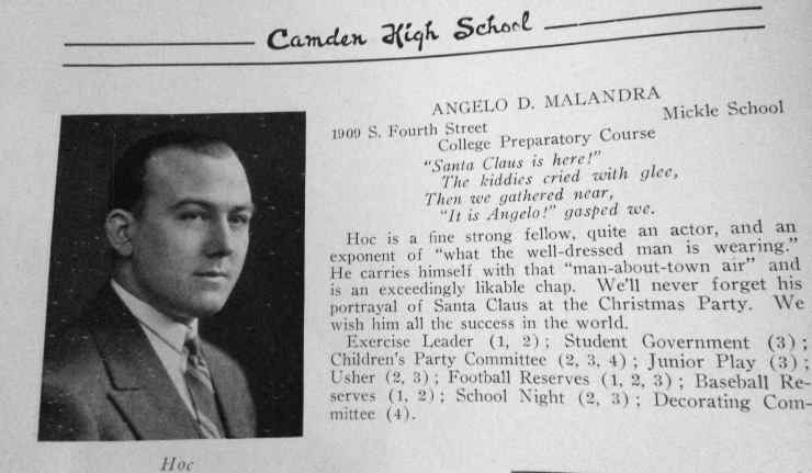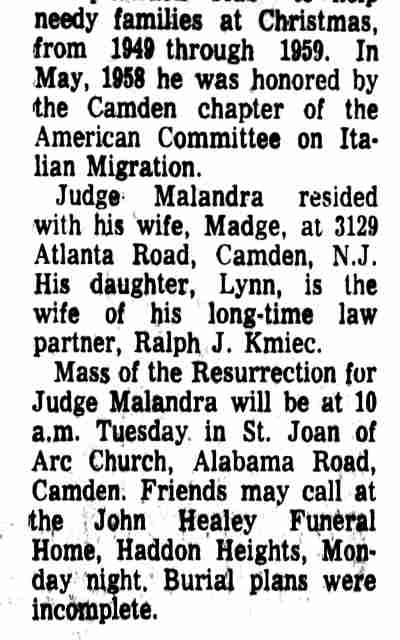 ANGELO D. MALANDRA was born in Pennsylvania on April 15, 1907 to Charles and Rose Malandra. The family moved to New Jersey sometime between 1912 and 1917. By 1930 the family had moved to 1909 South 4th Street in Camden's Eighth Ward. Charles Malandra by then had his own tailoring business. After graduating from Camden High School, Angelo Malandra furthered his education. He was attending law school at the time of the 1930 Census. He graduated in June of 1933. After passing the New Jersey bar Angelo Malandra remained in Camden, where he practiced law and was involved in local politics. He maintained offices in the Wilson Building at broadway and Cooper Street. Angelo Malandra was an associate of Felix "Man o' War" Bocchicchio, best known as World's Heavyweight Champion Jersey Joe Walcott. Angelo Malandra served as legal counsel for Bocchicchio and Walcott in the late 1940s and 1950s, and later served as Deputy Mayor of the City of Camden, and as a a judge. By 1947 he had moved to 1579 Collings Road North, in Fairview. He later moved to 3129 Atlanta Road. In 1961 Angelo Malandra turned his back on his former political patron, Mayor George E. Brunner and led a slate of seven candidates against him within the Democrat county committee. Angelo Malandra also was a leader in the 1961 campaign that change Camden's city government from its City Commission to a Mayor-Council format, effectively undoing the reforms of 1922. In 1967 Angelo D. Malandra was rewarded for his services to the Democrat party with an appointment to a judgeship by then New Jersey Governor Richard Hughes. Angelo Malandra died in February of 1973. His daughter, Lynne Malandra Kmiec, made her mark as Democratic chairwoman of Cherry Hill. She headed the Camden County Board of Elections and served as executive director of the Camden County Democratic Committee while George E. Norcross III was party chairman. She also served as chief of staff and political director for Democrat Congressman Rob Andrews. The Malandra Hall Recreation Center in Fairview is named in his memory. |