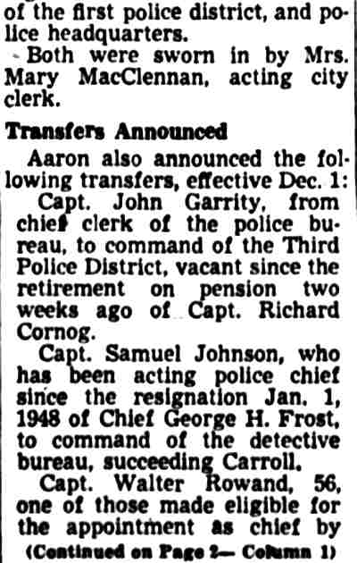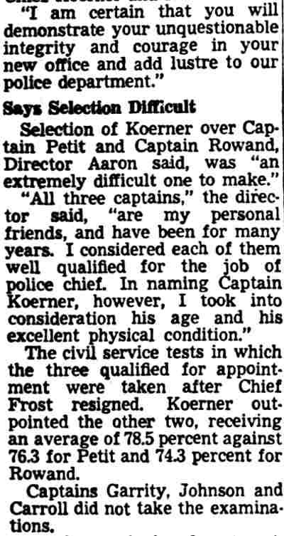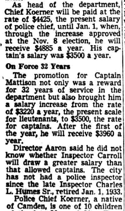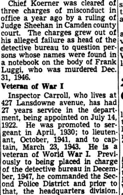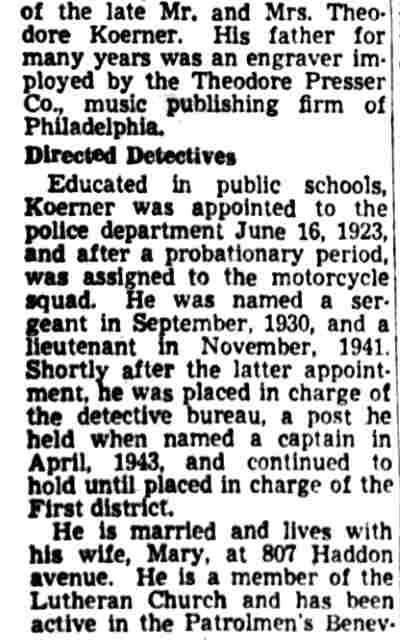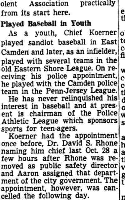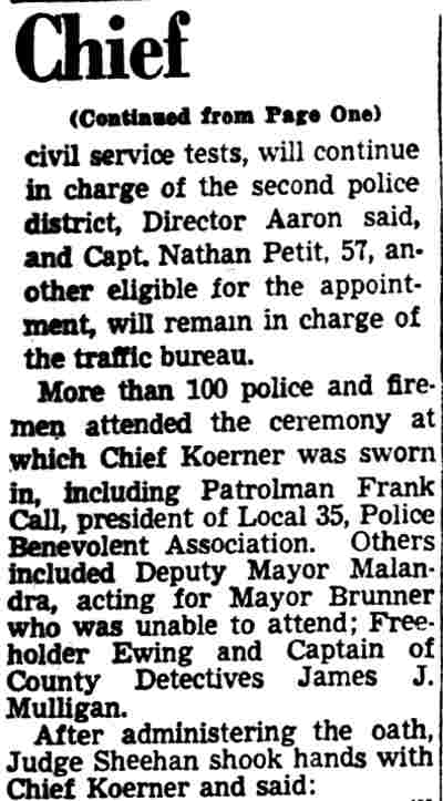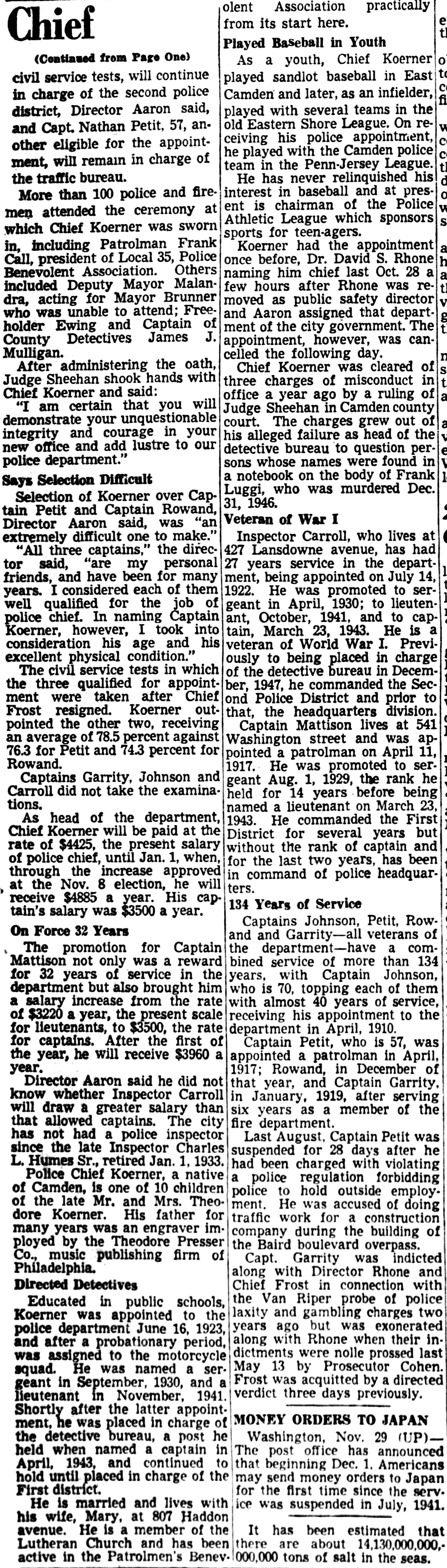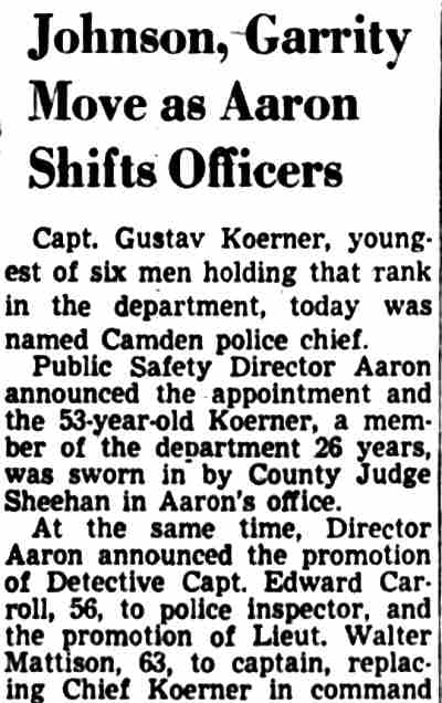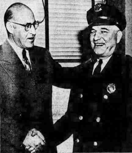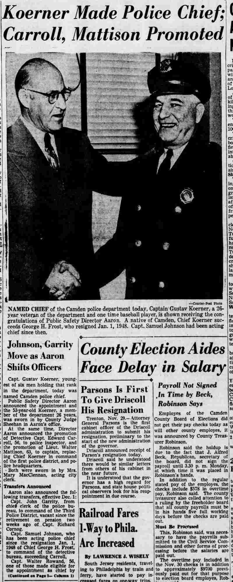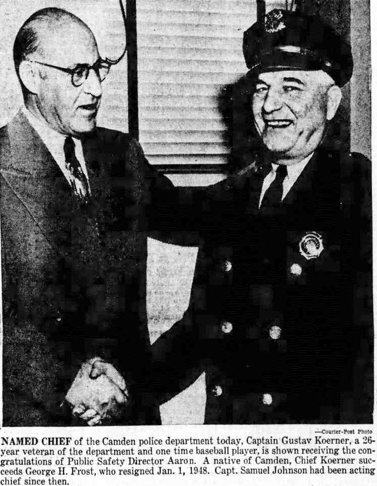 NAMED CHIEF of the Camden police department today, Captain‘Gustav Koerner, a 26-year veteran of the department and one time baseball player, is shown receiving the congratulations of Public Safety Director Aaron. A native of Camden, Chief Koerner succeeds George W. Frost, who resigned Jan. 1, 1948. Captain Samuel Johnson had been acting chief since then.