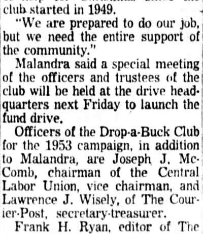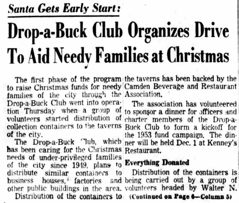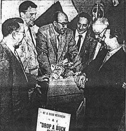 DROPPING 1200 BUCKS to help more than 500 families in the Camden area have Christmas cheer, workers in RCA Victor Division plants turned their contribution over to union officials who presented it Monday on their behalf, to-Drop-a-Buck-Club officials. Smiling at the total are, left to right. Bernard Kavanagh, president, Local 110; George Norcross, president, Local 106; Deputy Mayor Angelo Malandra, Drop-a-Buck chairman; Anthony Perry, president. Local 103; Frank H. Ryan, editor, The Courier-Post, and Daniel Arnold, international representative for the International Union of Electrical, Radio and Machine workers, CIO, with which the locals are affiliated.