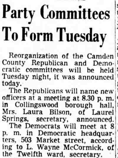 The committee follows; First Ward, Joseph Davis; Second Ward, David Hagarty; Third Ward, louis di renzo; fourth ward, John Odorisio; Fifth Ward, Mrs. Anna Anderson and Mrs. Lena Rago; Sixth Ward, John Salvatore; Seventh Ward, Mrs. Alfreda Hart; Eighth Ward, Anthony Bezich and Delaware Palmer; Ninth Ward, Oscar Moore; 10th Ward. Edward Kelley; 11th Ward, Mrs. Ella Mae Russell and Carroll Gooch; 12th Ward. Margaret Foley and Wayne McCormick; 13th Ward, Albert Becker and 14th Ward, John Emmel.