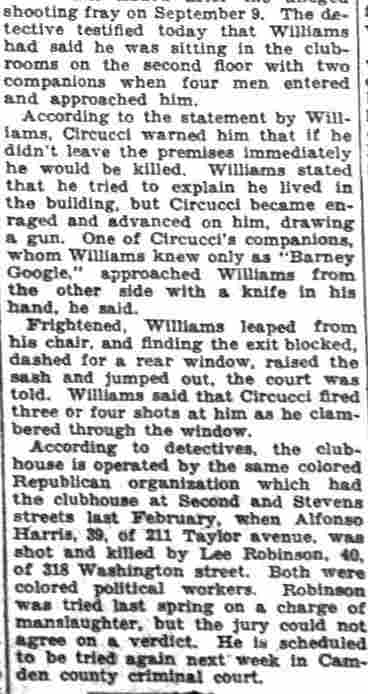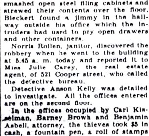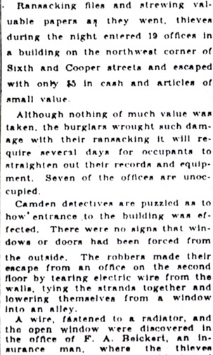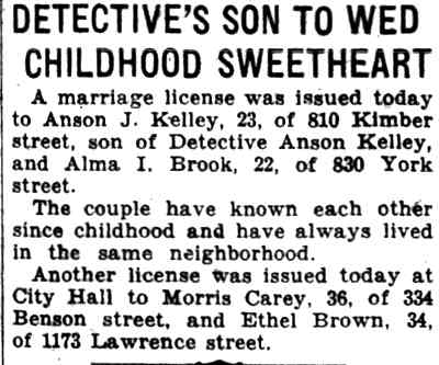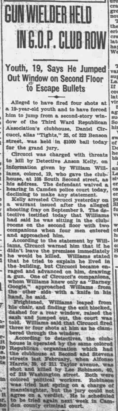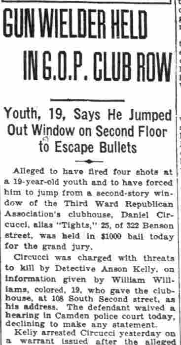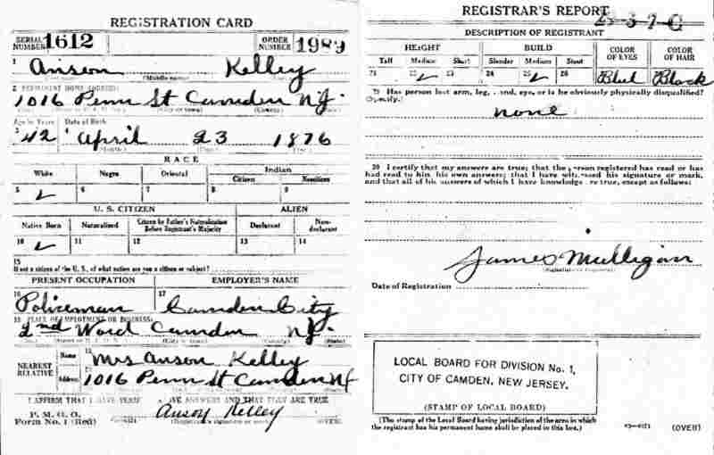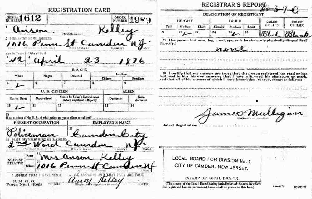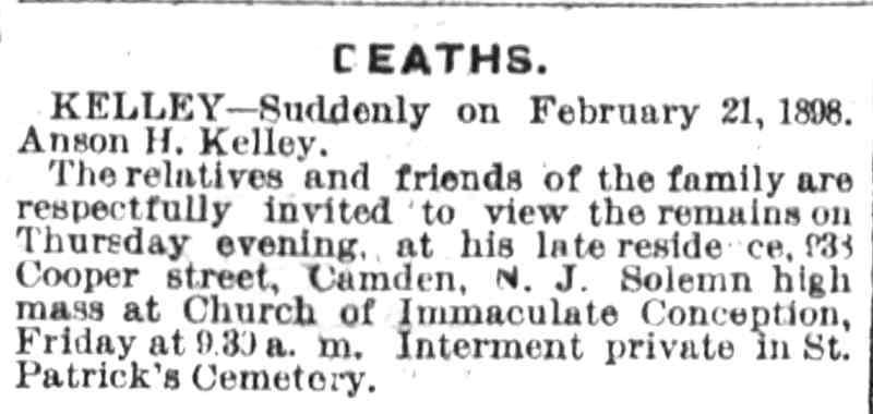 ANSON KELLEY, often referred to in the press of his time as Anson Kelly, served from January of 1912 until his retirement on January 1, 1933 with the Camden Police Department, many of those years as a detective. Anson Kelley was born April 23, 1875 in Camden, New Jersey. He was the sixth of twelve children born to Anson Henry Kelley and his wife, the former Katherine Matthews. His father was a laborer who worked himself up to be a foreman, working for the Pennsylvania Railroad. The family is listed at 206 South 4th street in the 1872 Camden City Directory, and at 317 Arch street in the 1874, a year in which Anson Henry Kelley worked as a railroad brakeman. Census records and City Directories show the family living at 115 South 5th Street in 1876, 231 Bridge Avenue in 1878, 205 Taylor Avenue from 1880 to 1885, 214 Bridge Avenue from 1887 to 1890, 212 Bridge Avenue in 1891, and 928 Cooper Street from 1891 to 1898. Anson Henry Kelley died February 1898 and was buried at St. Patrick's Cemetery in what was then the town of Stockton, which was annexed to Camden in 1899. All those buried at St. Patrick's cemetery were exhumed and re-interred at Calvary Cemetery by the end of 1924. The family moved to 567 Stevens Street. At the time of the 1900 Census the family consisted of Anson Kelley's mother, older brother Henry, and young siblings William, Katherine, Louis, Florence, and John. Anson Kelley lived at 567 Stevens Street until about 1906. During this time he worked as a clerk for the Pennsylvania Railroad, and as a house painter. He wed to Mary Carle in vary late 1905 or 1906. Her sister Elizabeth was married to James J. Daly, whose father owned Daly's Cafe at 800 Linden Street, and who took over ownership when his father died in 1922 and ran into the 1940s. The 1907 City Directory shows Anson and Mary Kelley living at 1012 Lawrence Street. A son, Anson James Kelley was born in February of 1907 in Camden. The Kelley family is listed at 1006 Lawrence Street from 1008 through 1910. Anson Kelley was working as house painter in these years. On May 16, 1909 Camden Lodge 111, Loyal Order of Moose was dedicated in Camden. Anson Kelley was one of the charter members. On January 3, 1912 Anson Kelley was appointed to the Camden Police department. The Kelleys lived at 1016 Penn Street from 1912 to 1923. They lived briefly at 809 Penn Street. By 1926 they were living at 801 Kimber Street. In