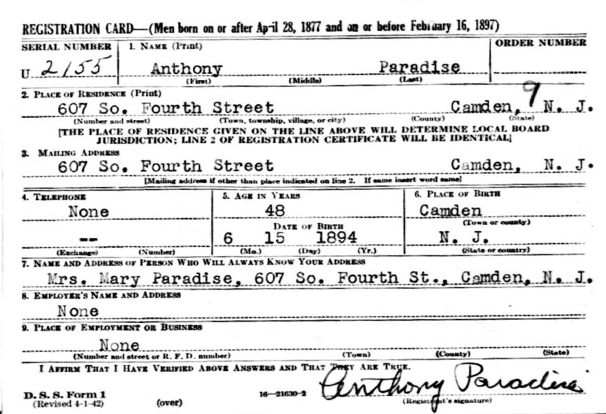 BABE PARADISE Declared to have confessed that he headed a narcotic "ring", which conducted an organized business in the sale of drugs throughout South Jersey, Anthony "Babe" Paradise was to have been given a hearing in Police Court today. His attorney, Samuel Orlando, appeared in the court and waited for a time this morning. Later because he had business elsewhere, he asked and received a postponement of the case until tomorrow. Detectives say Paradise had confessed the sale of drugs, but the widely known Third Ward character now declares he is the victim of a "frame-up" and does not know the three men arrested with him. |