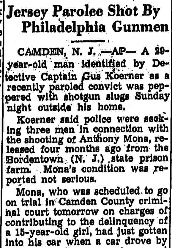 ANTHONY MONA was born February 21, 1918 in Calciano Italy to Vito Nicola and Chiarina (Catherine) Squeo Mona. The Mona family, which included younger brothers Michael and Vincenzo Nicola came to the USA in 1928, Vito Nicola coming first, his wife and children following aboard the SS Roma via Naples in July. Vito Nicola Mona was living at 318 Division Street when his family arrived from Italy. The 1930 Census shows the family living at 937 South Third Street, adjacent to dairyman Matthew Coccia. By the 1942 Vito Nicola Mona and the rest of his family, including Anthony Mona, were living at 947 South Third Street. Anthony Mona first came to the attention of police in 1938, when he was arrested for a holdup. An assortment of crimes minor and major resulted in him being sentenced to state prison in 1944. He walked away from a work detail in June of 1944, but was arrested in a bar near the Airport Circle in Pennsauken and returned to prison a few days later to complete a two-to-three year prison sentence.. Anthony Mona applied for and received a Social Security card in New Jersey around 1963. He died in December of 1966. The 1947 Camden City Directory shows a Mrs. Stella Mona living at 947 South Third Street. As Anthony Mona would have still been serving out his prison sentence when the directory was compiled, it is apparent that Stella Mona was his wife. Stella Mona, last a resident of Bellmawr NJ, passed in July of 1988. Anthony M. Mona, aged 42, of Bellmawr passed in September of 1992. He appears to have been the son of Anthony Mona. |