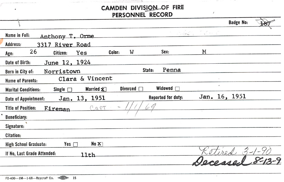 The 1956 and 1959 New Jersey Bell Telephone Directories show Anthony T. Orme living at 714 State Street in North Camden. He had moved to 3317 River Road in Cramer Hill by 1969, where he would live out his days. On January 1, 1969 Anthony Orme was promoted to Captain. He retired on March 1, 1990, having given faithful service to the City of Camden for over 29 years. Anthony Orme passed away on August 12, 1993 |
