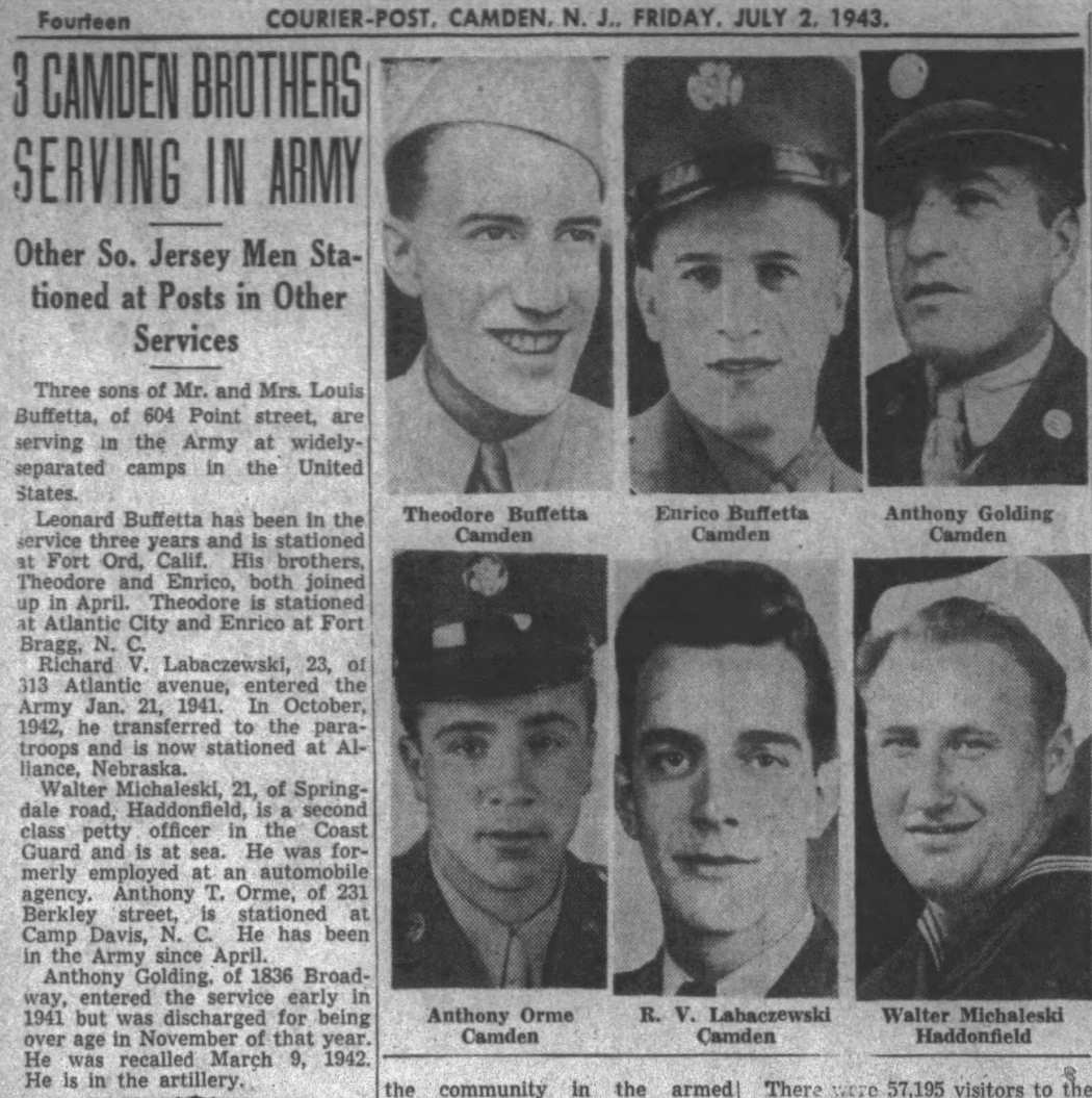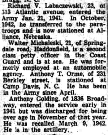 ANTHONY T. ORME was born in Norristown Pennsylvania to Clara and Vincent Orme on June 12, 1924. By April of 1930 the Orme family, which included siblings Lena and Vincent Orme Jr., had moved to 1826 South 4th Street in Camden, New Jersey. The elder Orme worked as a shoemaker to support his family. The family later moved to 231 Berkley Street. Inducted into the United States Army in April of 1943, Anthony Orme was stationed at Camp Davis, North Carolina in July of that year. Anthony Orme was living at 540 North 9th Street with his wife Anne when the 1947 Camden City Directory was compiled. He was then working as a wool sorter. On January 13, 1951 Anthony Orme was appointed to the Camden Fire Department. He was serving with Engine Company 2 in 1960. |