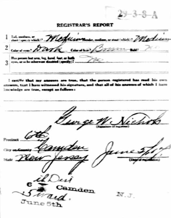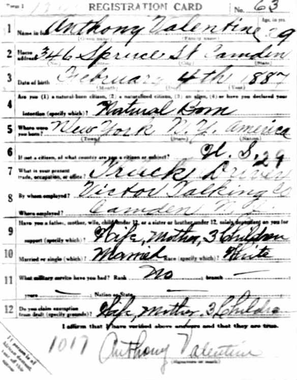 ANTHONY VALENTINE was born in New York City, New York on February 4, 1888 of Italian parents, Achille Valentine and his wife the former Benedetta DeGiudice. The family appears to have come to Camden after 1900. An "A. Valentine" is listed at 338 Cherry Street in the 1906 City directory, working as a bartender, this could possibly be Achille Valentine and family. Anthony Valentine married Anna May Maier on March 4, 1908. The 1910 census shows that Anthony Valentine lived with his wife and their son, Charles A. Valentine, at 346 Spruce Street. Anthony Valentine worked as a laborer at an oilcloth factory. His parents lived across the street, at 345 Spruce Street, along with Anthony Valentine's eleven year-old cousin, Joseph DiGiuidice (or DelGiodice). By the time the 1914 City Directory was compiled, Achille Valentine had passed away. Anthony Valentine and family, including his widowed mother and cousin Joseph lived at 820 South 4th Street. Anthony Valentine had by this time learned to drive, and worked as a chauffer, a term then also used to describe truck drivers. When he registered for |