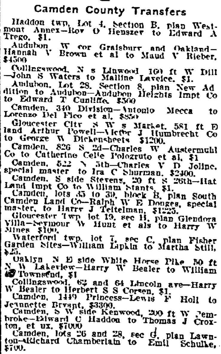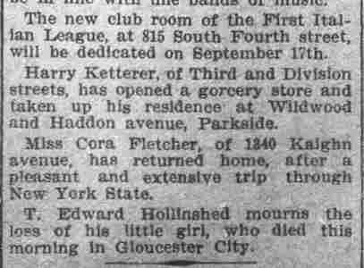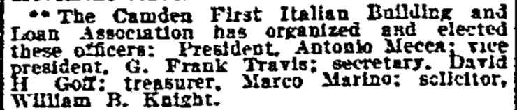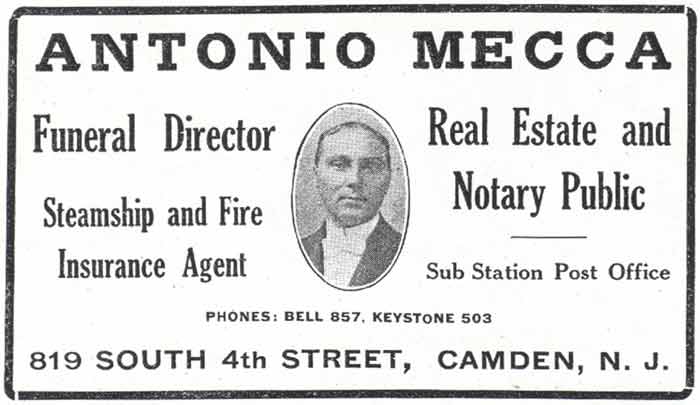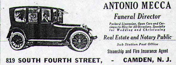 ANTONIO MECCA was born in Italy on November 26, 1873. The son of an itinerant fruit dealer, he had come to America in 1888. Antonio Mecca arrived in Camden in 1890 after picking berries in nearby Hammonton for a year, , and married his wife Isabella Gargano around 1894. Antonio Mecca began in business by selling fruit from a pushcart in Camden, and by 1902 owned a liquor store. In 1906 he opened a funeral business at South 4th and Division Streets. He was an organizer of the Camden Italian American Building Association, serving as president beginning in 1907. Besides the funeral parlor and the Building Association, Antonio Mecca was involved in real estate and fire insurance. He arranged steamship tickets to and from Europe, was a notary public, and ran a substation of the Camden Post Office from the building he had erected in 1908, which due both to its appearance and its importance to the Italian-American community came to be known as "The White House". The White House, at 819 South 4th Street, is a two story building designed in the style of a Mediterranean Villa. It was and still is situated in close proximity to two Roman Catholic churches, Our Lady of Mt. Carmel Church, 832 South 4th Street, and the church of St. Peter and St. Paul at Spruce and St. John Streets, just east of Broadway, and from these two churches Antonio Mecca initially drew much of his clientele. As his reputation grew and the Italian-American community spread throughout Camden, his business grew also. From the White House, Antonio Mecca became a navigator for those many immigrants who spoke no English. The post office sub-station he ran was to assist residents in sending money to family back in Italy. Besides his duties as a notary public, when needed, he interpreted for fellow Italians in Camden courts, helped neighbors get citizenship papers and waived fees for funerals if families did not have sufficient funds. "Tony Mec" as he was known in the neighborhood, also instituted a pre-paid funeral plan for working class families at fifty cents a week. He also operated a limousine rental service. The 1910 Census shows that Antonio Mecca, his wife Isabella, and his widowed mother Angiolina were living at 819 South 4th Street. Antonio and Isabella Mecca became American citizens in 1913. Mr. and Mrs. Mecca remained at 819 South 4th Street through the 1930 Census, and Antonia Mecca appears in the 1947 Camden City Directory. In 1919, Antonio Mecca, along with Joseph LaMaina, and Frank Viggiano founded the First Italian Building & Loan Association. The Mecca's next door neighbors from the 1910s through the 1940s were his relatives, the Fiore Troncone family. Fiore Troncone served for many years as a Detective with the Camden Police Department. Other neighbors included the Lario family on Pine Street, sons Frank M. Lario Sr. and Anthony M. Lario would become prominent Attorneys in Camden. Involved with many civic organizations, Antonio Mecca was also a member of the Camden Chiselers Club, which was organized in 1930 and included many members of Camden's political and business community. Antonio Mecca was still living and in the funeral business at 819 South 4th Street as late as 1947. He passed away in 1952. 819 South 4th Street was operated by long-time employee Richard Troncone as the Troncone Funeral Home for a few years after his death. Antonio and Isabella Mecca rest at Calvary Cemetery in what is now Cherry Hill NJ. The White House at 819 South 4th Street still stands today. As the neighborhood changed, the building had deteriorated, and by the early 1990s it was totally unusable. Due to the efforts of Sal Scuderi the building was restored. In May of 2001, it opened again to the delight of some hundred current and past residents who turned out for its dedication. |