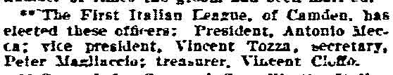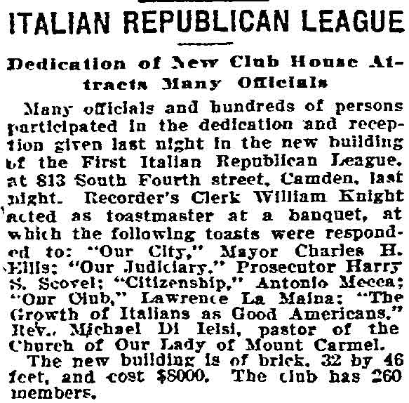 Italian Women Republicans Stage Second Annual Ball Prominent Republicans gathered last night at the First Italian Republican League hall, 813 South Fourth Street, for the second annual ball of the Camden County Italian Women's Republican Club. The grand march was led by Mr. and Mrs. Antonio Mecca, followed by Mr. and Mrs. Anthony Laviano, Mr. and Mrs. Cascini, Mrs. Mamie Piraine, president of the club, with Anthony Di Marino, and Mrs. Anna Larusso with Harry Larusso. Mrs. Mecca was chairman of the ball, assisted by Mrs. Laviano, secretary; Mrs. John Gargano, treasurer; Mrs. Frank Valeriano and Miss Mary Lario. In addition to Mrs. Piraine, officers of the club are Mrs. Larusso, secretary; Mrs. Margaret Viggiano, secretary; Mrs. Josephine Tamru, financial secretary, and Mrs. Madeline Salvatore, treasurer. Among the guests were Walter S. Keown, chairman of the Republican county committee; Assemblymen Frank M. Traveline, Jr., and George D. Rothermel, Postmaster Charles H. Ellis, County Detective Fiore Troncone, Miss Marie Doyle and Mrs. Pauline Caperoon, of Republican headquarters, and Walter Sekula, candidate for freeholder from the Eighth Ward. |