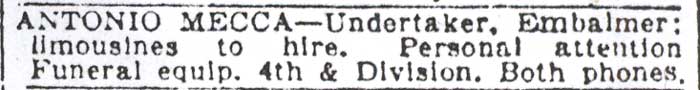 ANTONIO MECCA, widely known and respected throughout Camden, and especially in the Italian section of the city where his business interests have been located for years, is a man who wholly by his own efforts and energy has won his way and found goals of success. One of the leading undertakers in the city and very well known in New Jersey for his painstaking methods and the personal kindly interest he takes in the practice of his profession, Mr. Mecca has exemplified through a life of continuous activity and usefulness the great value of the quality of perseverance. His courage and his talents have been the means of bringing him to the fore in business, political and social matters: and as one of the results of his indomitable good nature and his deep interest in the social progress of the people of his own nationality, he fraternizes generously with many associations, and holds office in many. The story of his career is that of one who has toiled hard and with merited success for the results attained. He is a son of Vitio Mecca, who was engaged in the grocery business, and who died July 16, 1896, and of Angelina Marie (Rinelde) Mecca, who makes her home with her son. Antonio Mecca was born November 26, 1873, in Italy, and though he attended the schools of his native place, the facilities were poor, and early in life he went to work on his father's farm, prior to his removal to the United States. He well recalls the brave efforts he made to establish himself here and to make a living: In 1888-1889, for example, he took the first Job that was offered him, and he spent his time profitably in picking berries in Hammonton, and then he went to Camden to try to make his way into more promising business. As a result he worked in a Federal Street fruit store one year, after which he bought a pushcart, and sold merchandise on the streets. Thereby, he was enabled to earn enough money to open an oyster saloon on Market Street, in 1891, turning that into a liquor saloon after the first year, and he so continued, and in the same location, until 1905. It was while engaged in the saloon business that he found many opportunities for association with real estate and fire insurance matters; and he accepted such opportunities. And it was at this time that he made his first start in the undertaking business, serving an apprenticeship of five years with George Taylor, of Camden, a prominent funeral director, and that apprenticeship being served while Mr. Mecca was able to give spare time from other work. He was therefore able to take out his undertaker's and embalmer's license in December, 1906, and he started his funeral directing establishment at No. 330 Spruce Street. With the requirements for the increase of his varied interests, and particularly those attending the modernizing of his undertaking business, he built his residence and office at Division and Fourth streets in 1908, and began to occupy the premises in 1909. Since that date, also, he has had charge of a sub-post office at his residence and office, and he also is a notary public. Mr. Mecca disposed of his saloon in 1905, and gives all of his attention to his present business. He was made vice-president of the Victory Trust Company, of Camden, December 1, 1923. Since 1907 he has been president of the Camden Italian Building and Loan Association; and he is a member of the board of directors of the Italian and American Building and Loan Association, of which he was one of the organizers. He was court interpreter in the Camden criminal court for six years, 1900-1906; and by appointment of Judge Lyon of the Municipal Court he was interpreter for that court from 1906 to 1912. Mr. Mecca has many fraternal interests, and he is well-esteemed and popular in all. He is a member of the Improved Order of Red Men; has been president of the Italian Republican League since its organization; member of the Italian Beneficial Association of Philadelphia, the Italian Beneficial Columbus Society; and a member of at least ten other Italian societies. His business interests also prominently associate him with the National and State Associations of Funeral Directors. He is a communicant of the Our Lady of Mt. Carmel Roman Catholic Church. Mr. Mecca married, September 22, 1892, at the Italian Roman Catholic Church in Philadelphia, Isabella Gargano, a daughter of John Batisto Gargano, who died January 18, 1914, and of Teresa (Penelle) Gargano. Mr. and Mrs. Gargano came to the United States from Italy in 1888, settling in Philadelphia. They were the parents of ten children. |