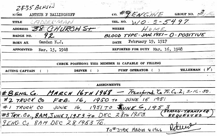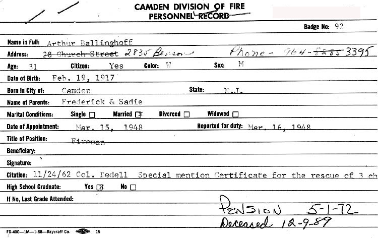 ARTHUR FREDERICK BALLINGHOFF was born February 17, 1917 in Camden, New Jersey to Frederick and Sadie Ballinghoff. He lived in East Camden most of his life. His parents had lived at 27 Morse Street in 1914, but when his father registered for the draft in June of 1917, the family, which included an older sister, Evelyn, lived at 733 Fern Street in North Camden. The family had relocate d to 737 Fern Street by January of 1920, before returning to East Camden. The Ballinghoffs were residing at 2950 Cramer Street, the corner of North 30th and Cramer Streets, by 1924 and were still there as late as 1969. Arthur F. Ballinghoff was inducted into the United States Army on November 25, 1940, reaching the rank of Corporal before being honorably discharged. He was one one of the first seventeen men from Camden to be drafted. Both Arthur Ballinghoff and another of the seventeen, Theodore N. Guthrie, became a member of the Camden Fire Department after the war ended. He served overseas with the Antitank Company of the 114th Infantry Regiment, 44th Infantry Division, and saw action in Southern France, Germany, and Austria. He returned to the United States aboard the Queen Elizabeth in July of 1945, and to Camden upon leaving the military. The 1947 Camden City Directory shows Arthur Ballinghoff living with his parents at 2950 Cramer Street in East Camden. He was then working as a warehouseman at the Cashan & Co., Inc. food products business at 207-209 Kaighn Avenue. Arthur F. Ballinghoff was appointed to the Camden Fire Department on March 15, 1948 and reported for work the next day at Engine Company 8 on Kaighn Avenue the next day. His first cousin, Joseph Ballinghoff Jr., had joined the Fire Department in 1938 and was serving with Engine Company 3 at that time. Arthur Ballinghoff remained at Engine 8 until February 16, 1950 when he was reassigned to Ladder Company 2, which was quartered in the same building. On June 15, 1951 Arthur Ballinghoff was reassigned to Ladder Company 1 at Fire Headquarters, North 5th and Arch Street. After almost two years at Ladder 1, his request for a transfer to East Camden was granted, and Arthur Ballinghoff was sent to Ladder Company 3 at North 27th and Federal Street on June 5, 1953. At the end of that year he was reassigned to Engine Company 9 at the same East Camden location, and remained with Engine 9 until March 4, 1966 when he was returned to Ladder Company 3. Arthur Ballinghoff retired after 24 years of service to the City of Camden on May 1, 1972. The 1956 New Jersey Bell Telephone Directory lists Arthur Ballinghoff at 306 North 37th Street in East Camden. By October of 1959 he had moved to 38 Church Street. Arthur Ballinghoff later moved to 2835 Benson Street. On November 24, 1962 Fireman Ballinghoff was cited by Public Safety Director Bedell for taking part in the rescue of three children. In his later year Arthur Ballinghoff resided in Pine Hill, New Jersey. He died on December 9, 1989 and was buried at Beverly National Cemetery in Beverly, New Jersey. He was survived by his wife, Evelyn, who joined him on August 19, 1990. |