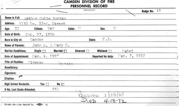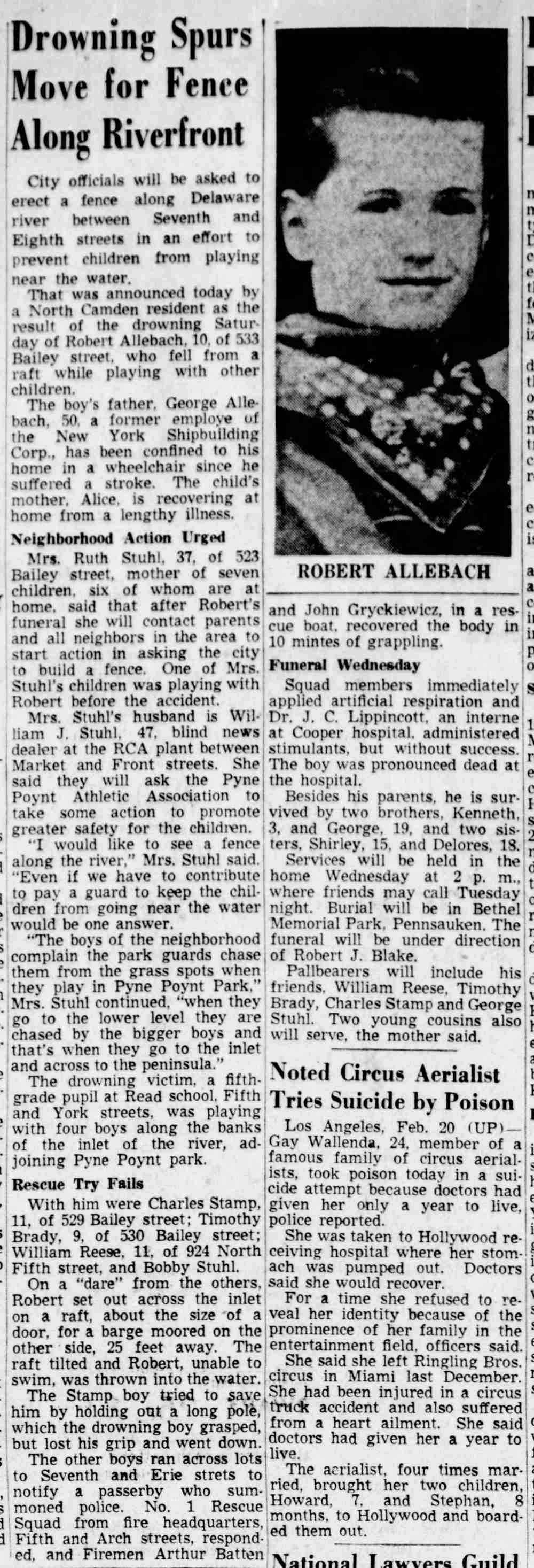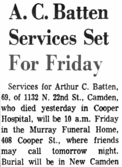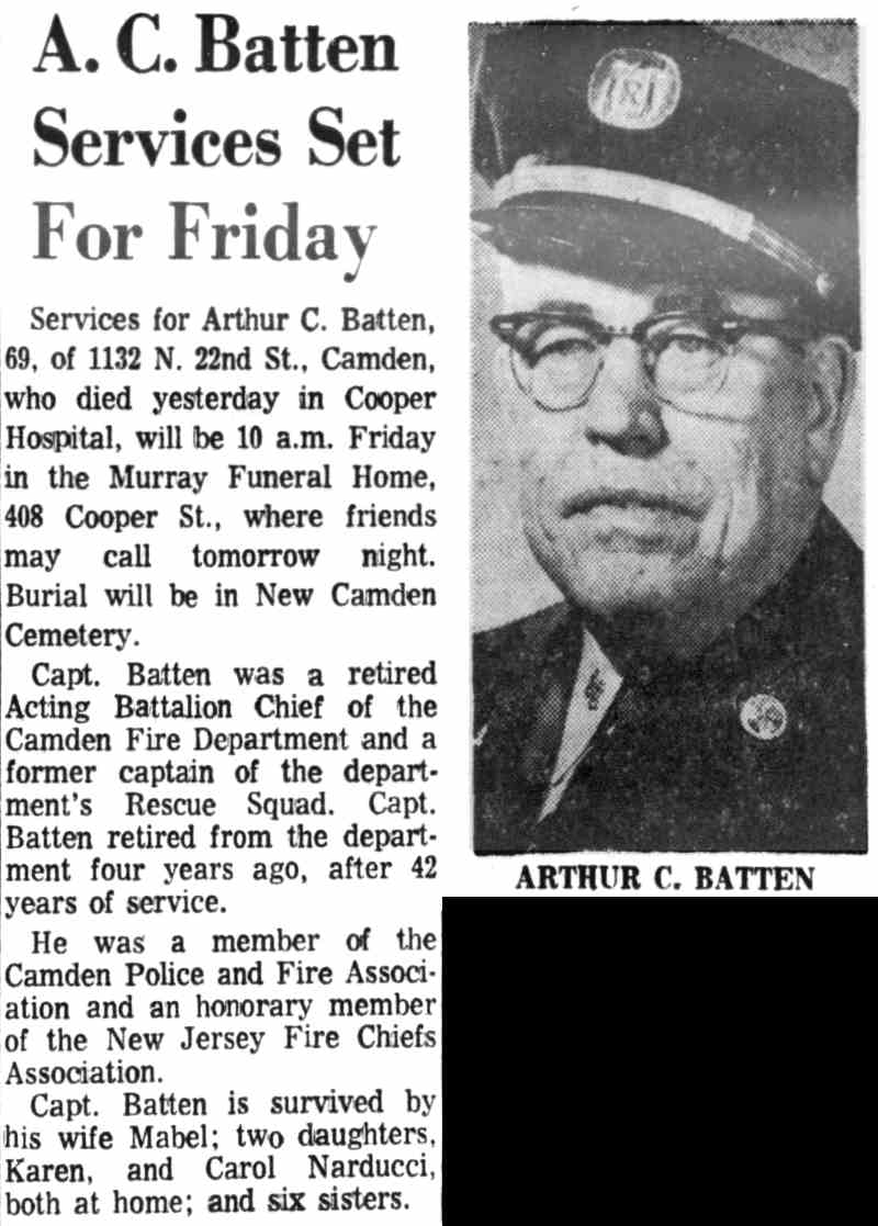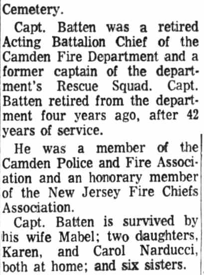 AND FIREMEN WILL ELECT TODAY The Camden Police and Firemen's Association will hold election of officers today at its headquarters, 1175 Whitman Avenue, from 1:00 PM to 9:00 PM. Herbert Bott is unopposed for re-election as president. William Thorn is unopposed to replace Richard Middleton for financial secretary and Walter Vecander is unopposed for the new post of assistant financial secretary. All these are police officers. The police trustees will be named from the following nine candidates: William Marter, George Ward, William Britner, Joseph Shreeve, William Schriber, Joseph Mardino, Joseph Dunnett, Leon Feltz and Russell Young. Two police sergeant-at-arms will be chosen from among Stanley Wirtz, Harry Cattell, Joseph Schultz and George Clayton. Three candidates are seeking the post of vice president, which goes to a fireman. They are William Spencer, Charles Edwards and albert dukes. Warren Rich, a fireman, is slated to succeed himself as recording secretary and Winfield Leviseur is unopposed for the new post of assistant recording secretary, which goes to a fireman. Four fireman trustees will be chosen from ten candidates. They are charles cook, Henry Baumgartel, walter eastlack, Arthur Batten, William Getner, William Toy, lawrence newton, James Young, Russell Anderson and William Taylor. Three firemen are seeking two posts as sergeants-at-arms. They are William Judge, John Mulligan and Furman Price. |