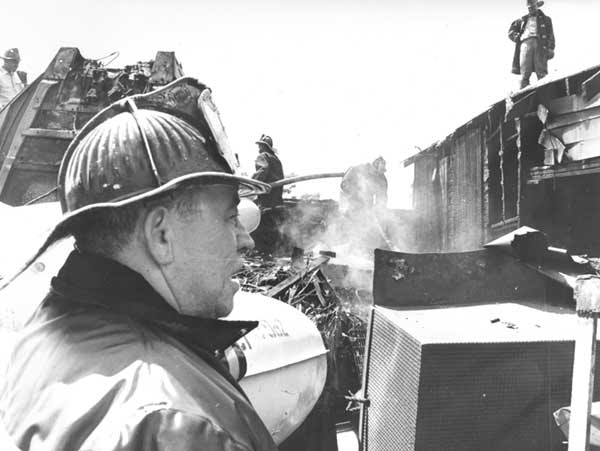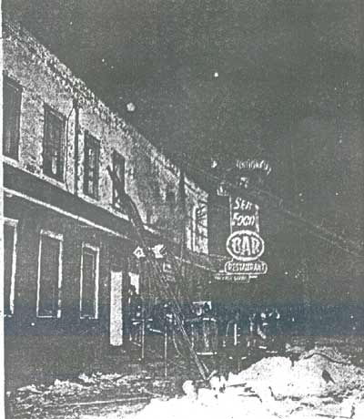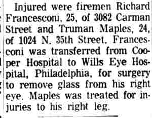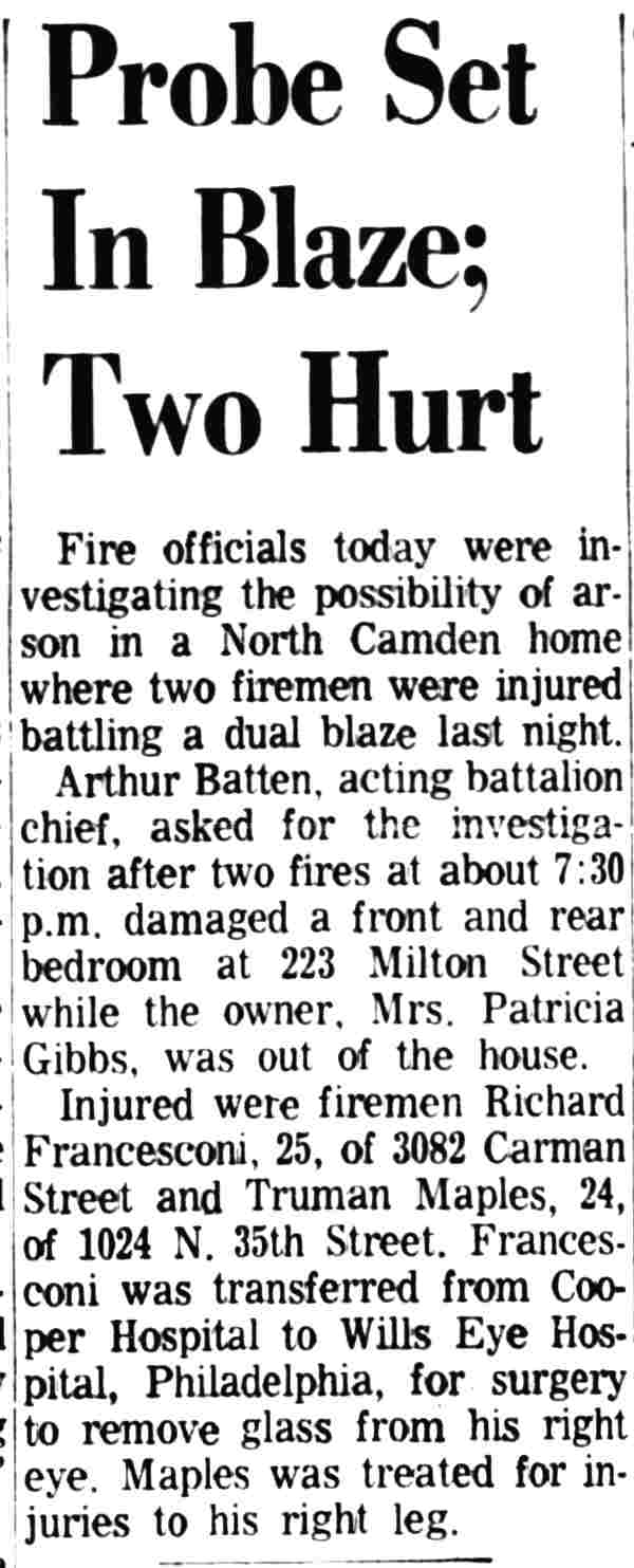 Saved by Firemen City firemen fought smoke, flames; snow and a biting cold during the night and early morning hours as a rash of fires severely damaged four buildings and destroyed a tavern. According to Public Safety Director Keith Kauffman, at one point only two engine companies were not actively fighting the blazes as seven engine companies, three ladder companies, the rescue squad and three battalion chiefs were at the fire scenes. At the site of the worst fire, 5th and Mickle Streets, police and firemen braved dense smoke and fierce flames to rescue four elderly persons trapped in first, second and third floor apartments. Started In Tavern Lounge The blaze, which broke out in the lounge of Ray's Tavern, was discovered by Patrolmen Augustus Balzano and Anthony Saponare at 3:58 a.m. after they were alerted of smoke by highway employees battling the second snowstorm of the week. The two policemen, after radioing the alarm, kicked in the door of the tavern and raced through the smoke and flames to rescue Mrs. Agnes Lockhart, 58, from her upstairs apartment. The patrolmen took Mrs. Lockhart to Cooper Hospital where she was admitted with a cut head and smoke inhalation. Minutes later firemen, headed by Battalion Chief Biaggio Ardire, arrived. Ardire said the tavern was engulfed in smoke and flames. He said the flames leaped from the tavern roof to a luncheonette and apartment building next door. Ardire said firemen raised a ladder to the third floor of the second building where Mrs. Mabel Seward, 64, was hanging from a window ledge. However, fireman were hampered in the rescue attempt by the narrow space of the alley and could only hold the screaming woman until other firefighters could make their way to the third floor window from inside the building. The rescuers, wearing face masks, wrapped Mrs. Seward in blankets and carried here through the flames to safety. Two Carried Out At the same time, more fire fighters entered the burning building and carried out Mrs. Viola Lagerprantz, 65, who lived in a rear apartment on the first floor and John J. Smith, 86, from a second-floor apartment. All the victims were taken to Cooper Hospital for smoke inhalation treatment and released an hour later. Kauffman ordered the victims, still wrapped in blankets, taken to fire headquarters at 3rd and Arch Streets and notified city welfare authorities. The Welfare Department obtained temporary housing for the three victims at Volunteers of America headquarters, 828 Market Street. Each victim lost all possessions in the blaze. Additional Alarms Ardire, at, 4:27 a.m. called for additional fire crews and an hour later requested more aid. Battalion Chief Daniel Jiannetto's unit answered the first distress call while Acting Battalion Chief Arthur Batten's men arrived on the second plea. Batten's unit had been fighting two North Camden blazes since 10:53 last night. Ardire said that when firemen attempted to get into the buildings, the fire was raging forward, backward, and straight up the stairwells out of control. The owner of the luncheonette, Dominic Padulla; arrived at the scene about 5:30 a.m. Padulla and his brother, Frank, who also had been out, live on the first floor. Canteen Truck on Scene Volunteers of America Canteen truck with Colonel William Gwynne also was at the scene and served firemen coffee and donuts. Fire Chief Edward Michalak said he has ordered a complete investigation of the fire. Kauffman said 5th Street south of Mickle and Mickle Street east of 5th has been closed to traffic indefinitely. In the two other fires in North Camden, a grocery store was damaged at 442 N. 9th Street, and two vacant buildings at 623-625 North Front Street were damaged. Grocery Store Blaze Batten said a defective chimney apparently caused the grocery store blaze which raged through joists and partitions. The store is operated by Benjamin Lamberte while the building is owned by Mrs. Sarah Schecter of Baird Boulevard according to the battalion chief. Batten's crew were forced to make two trips to the vacant buildings as wind whipped flames. He said the fire probably was caused by vagrants seeking shelter from the snowstorm. Before the firefighters could take off their fire apparel, they were dispatched to the 5th and Mickle Street blaze. |
