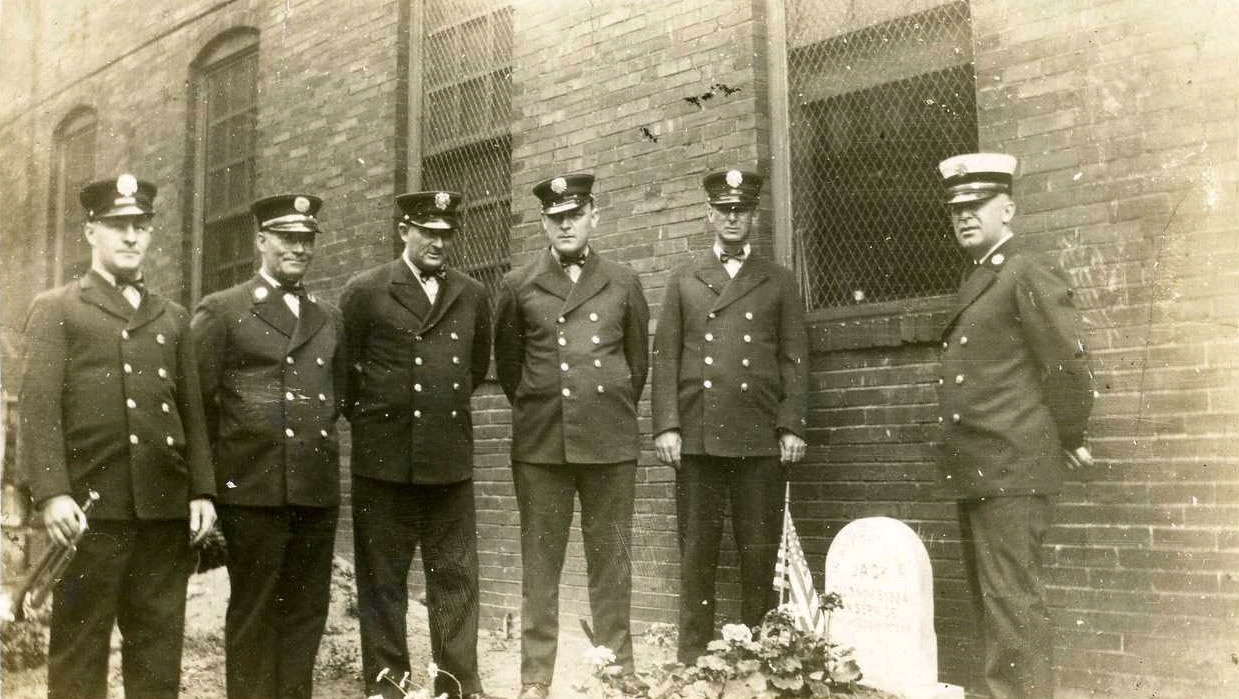 Funeral for Fire Mascot Jack Below, November 1934, at grave site immediately following ceremony for "Jack", from left: Fireman John Yates, Captain William Van Pfefferle, Fireman William Hopkins, Fireman Lester Anderson, Acting Captain Edgar Ellender, Deputy Chief William Harring. |