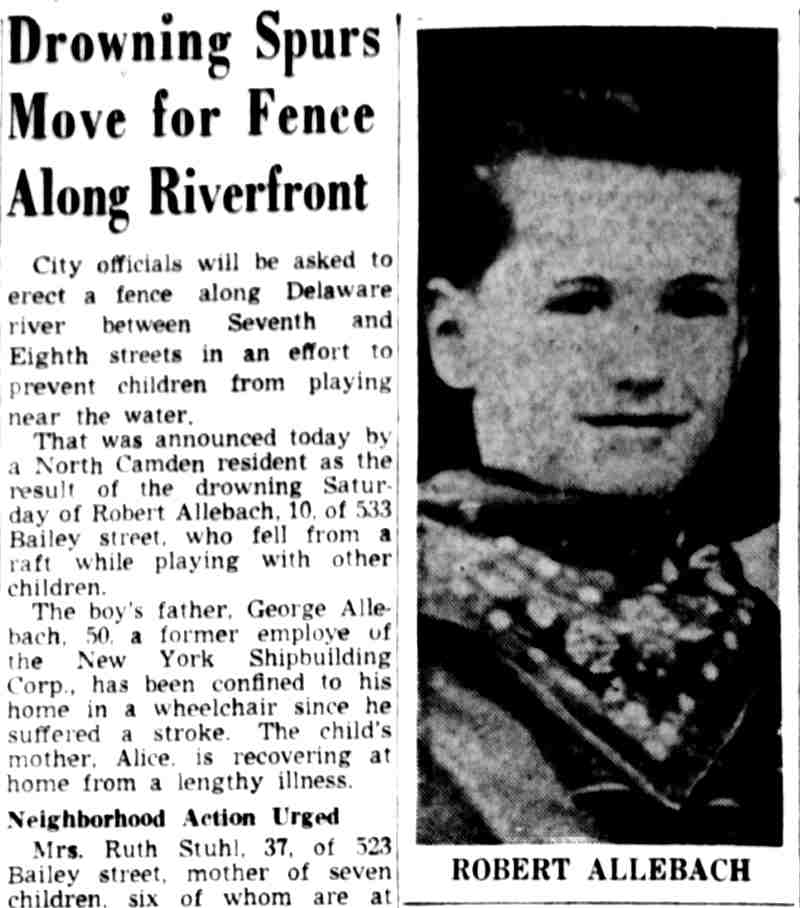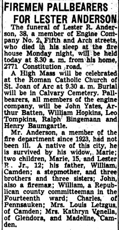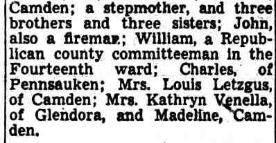 Magin Laid to Rest By War Veteran Buddies Funeral services for City Commissioner Henry Magin were held today with his colleagues in official and veterans circles participating. Services were conducted in city commission chambers on the second floor of city hall, in charge of Rev. Dr. W.W. Ridgeway, rector of St. Wilfrid's Episcopal Church. The casket was carried by war veteran associates of the public works director, who died from a heart attack Friday. A color guard from the Veterans of Foreign Wars and the American Legion preceded the casket, followed by the four remaining members of the city commission, Mayor George Brunner and commissioners E. George Aaron, Mrs. Mary W. Kobus and dr. david s. rhone . A guard of honor lined both sides of' city hall steps, 22 policemen on one side and 22 firemen on the other, representing Magin's age, 44 years. Hundreds of men and women waited outside the building to pay their respects as the solemn procession filed by. Mayor Brunner had declared this morning a holiday for city employees. The casket was borne by Thomas Jackson and Samuel Magill, both past Legion commanders; Leon McCarty, past commander of August Walter Chapter, Disabled American Veterans; Richard Jermyn, past commander of Post 1270, Veterans of Foreign Wars; Benjamin P. Thomas, past captain of Sparrow Ship No. 1269. V. F. W.; and William Miller, past State commander, D. A. V. Three trucks were required to carry the floral pieces from the scene of the services to the National Cemetery at Beverly, where burial took place. An estimated 8000 persons from all walks of life paid their respects to the late official by viewing the body as it lay in state in the commission chambers. The throng of mourners of Camden city and county was the largest to converge on a public building since the funeral of Fire Chief Charles Worthington, who was killed while fighting a fire almost 20 years ago. His body was placed on public view in the rotunda of the old county courthouse. File Past Bier A continuous progression of people filed past the flag draped bier for more than three and one-half hours. Scores of Republicans and hundreds of Democrats joined in the tribute. Services were conducted by Camden lodges of Elks and Moose. Military rites were conducted by the Fairview Post, American Legion, of which Magin was a founder and past commander. The tribute was led by Mitchell Halin, post commander, and C. Richard Allen, past department commander. James W. Conner, chief clerk of the city water bureau and past State Commander of the V.F.W., conducted rites at the grave. Mayor Brunner and Commissioners kobus, Aaron, and rhone came early and remained throughout the hours of viewing. Mrs. Helen Magin, the widow, and daughter Helen, attired in deep mourning, arrived shortly after 7:00 PM. Embraces Widow, Daughter Commissioner kobus , who knelt in prayer before the bier, arose and went over to Mrs. Magin and her daughter. Mrs. Kobus embraced and kissed the widow and daughter of the late commissioner. They were in tears. Three firemen and three policemen maintained a vigil as a guard of honor. They were Patrolmen Jack Kaighn, george weber, and William Deery and Firemen Arthur Batten, Warren Carter and William Reed. American Legion and V. F. W. members in uniform alternated as members of the military guard of honor. A detail of 50 policemen was under command of Acting Lieutenant John Garrity. Fifty firemen, under supervision of Deputy Chief Walter Mertz, assisted the patrolmen in handling the crowd, which at times choked the stairways leading to the second floor. Freeholders Arrive Albert H. Molt, director of the Board of Freeholders and Freeholders John J. Tull, oscar moore, Ventorino Francesconi, Stanley Ciechanowski, Earl Armstrong and Emil J. McCall arrived shortly after 7:00 PM. Moore and Tull wore American Legion overseas caps. Albert S. Marvel, clerk of the board, accompanied the freeholders. Employees of the various bureaus in the department of public works, headed by Commissioner Magin, came in delegations with the highway bureau having 150, the largest number. Frank A. Abbott , acting director of the department, accompanied by James P. Carr, superintendent of Streets; led the highway bureau employees. abbott is deputy director of revenue and finance and first assistant to Mayor Brunner. He was named by Brunner as acting director until the City Commission elects Mr. Magin's successor. County Clerk frank J. Suttill, City Clerk Clay W. Reesman , Fire Chief john H. Lennox and James A. Howell, chief of the city electrical bureau, attended, as did Albert Austermuhl, secretary of the board of education. Every city department sent a flora l piece. Outstanding Floral Tribute Outstanding among the floral tributes was a six-toot broken circle of varied flowers, an offering from Mayor Brunner and Commissione rs kobus, Aaron, and rhone. A floral chair was sent by the Camden Police and Firemen’s Association. The word “Rest” was made up of flowers. The offering of the Veterans League of South Jersey, an organization formed by Commissioner Magin and of which he was the first president, was a large floral pillow. The freeholders and county officials gave a large floral basket. Floral tributes came from the employees of the board of education, the RCA Manufacturing Company, the police and fire bureaus, Pyne Point Athletic Association, the elks , Moose and several Democratic clubs. The floral tributes came in such numbers yesterday afternoon that Funeral Director Harry Leonard and his assistants could not find room for them in the commission chamber proper. They were banked on both sides, in the rear and over the ca sket. Among prominent officials and citizens who came to pay their respects were Congressman Charles A. Wolverton and his son, Donnell, Assemblymen Joseph W . Cowgill and J. Frank Crawford, Sidney P. McCord, city comptroller, Thomas C. Schneider, president of Camden County Council No. 10, New Jersey Civil Ser
