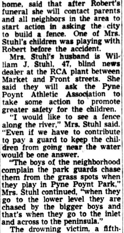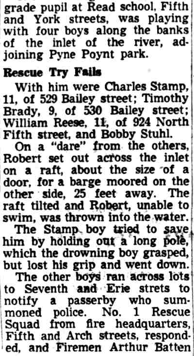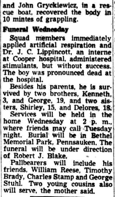 NO HOPE is expressed in the face of this fireman as he and other firemen vainly try to revive Riley Drummond,12, and his sister, Terry, 7, two of the three Drummond children who drowned Wednesday afternoon at Cooper River Park. The body of the third victim, Mary, 8, was taken from the river five hours later. Shown working (left to right) are Fireman Wesley Faust, Captain Arthur Batten, Firemen John Yates, of Rescue Squad 1, Mario Fattore, of Engine 3, and Henry Keubler, of Engine 3. |