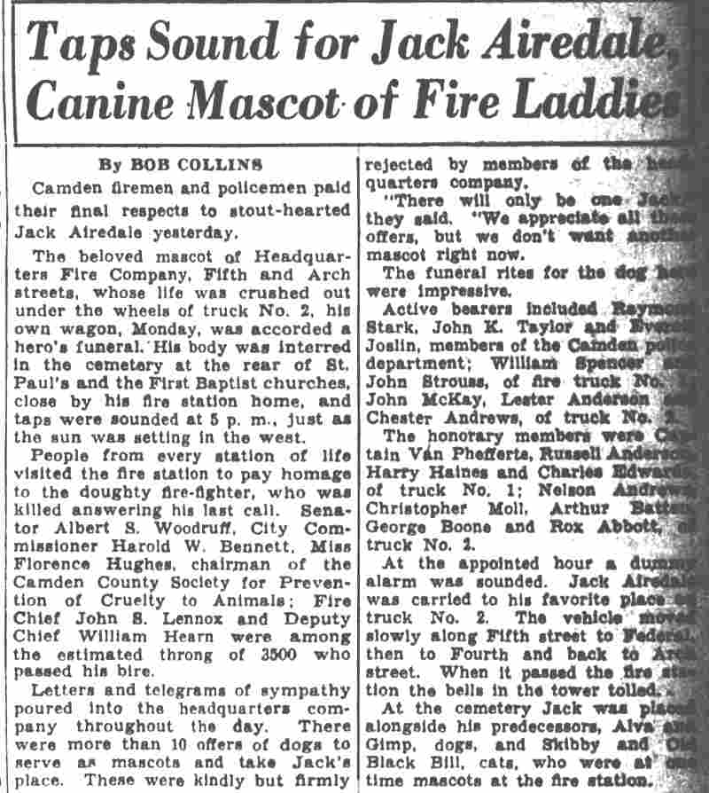 The American Fire Service has always held domesticated animals as esteemed mascots and the Camden Fire Department was certainly no exception. Through the years there have been many types of mascots in the Department including monkeys, cats, goats, and of course the most popular mascot, the dog. Dating back to the days of horse drawn fire apparatus and even earlier when carriage dogs formed an integral bond with horses, canines distinguished themselves as animals especially attuned to firehouse life. Jack was the company mascot of Engine 2 and Ladder 1 at old Fire Headquarters for over five years and he was described as an intelligent Airedale of good humored nature. Jack never missed an opportunity to climb aboard the apparatus and answer alarms with his beloved masters. The sight of Engine Company 2 roaring out Federal Street with Jack perched high atop the apparatus, wind blowing in his face amid the shrill pitch of the buckeye whistle and clanging bells was a unforgettable scene. Occasionally and as with all active canines, Jack would be out of quarters and around the corner or down the street when an alarm was transmitted. At such times he would dash down Fifth Street until he caught up with the rolling apparatus and would skillfully leap upward to his accustomed place on the rig. It was under these circumstances that Jack lost his life. The Department phone jingled and the Housewatchman turned out both companies for an alarm at 119 N. 9th Street. Jack got a late start on the hike and chased the apparatus out Federal St. where he tangled with an automobile at Broadway. While trying to avoid the car Jack darted into the path of the apparatus and was fatally injured. The men of the Engine and Truck were heart broken. Jack was buried the next day in the rear yard of Fire Headquarters in the place that had been his home since puppyhood. Flowers were planted to adorn the fresh grave while some of the toughest Firemen in the house were visibly grief stricken. One year later on the anniversary of Jack's death a memorial service was held after Roll Call in the rear yard of Fire Headquarters. The members erected a tombstone and in a quiet service, Fireman John Yates blew taps over Jack's grave. There were no words spoken. All that needed to be said was inscribed upon the little headstone; "Our Faithful Pal Jack" died in service, November 5, 1934. |
