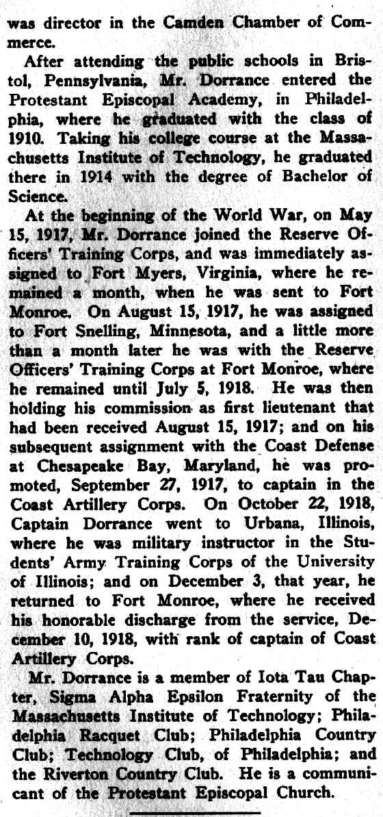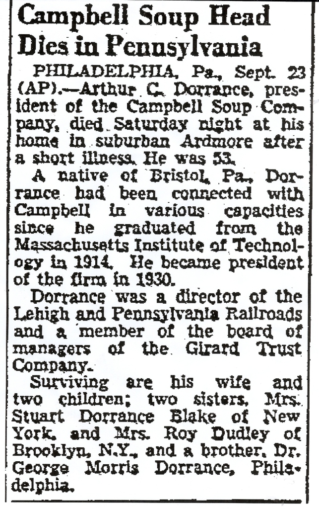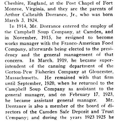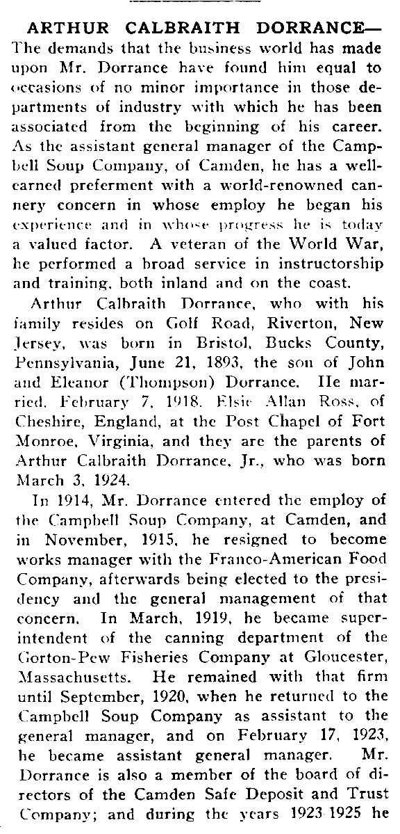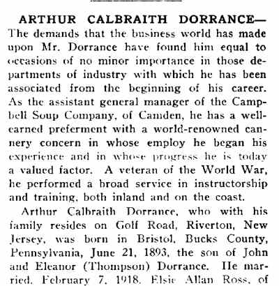 ARTHUR CALBRAITH DORRANCE was the younger brother of Dr. John T. Dorrance, a brilliant scientist who after taking a position with the Joseph Campbell in Camden in 1887, invented the condensed soup that made Campbell Soup a household name around the world. The Dorrance family eventually gained sole control of the company and retained a majority of the shares when the company went public in the 1920s. Having worked at Campbell Soup for many years, Arthur Dorrance succeeded his brother as president of the firm after Dr. Dorrance passed way in September of 1930. Arthur C. Dorrance served as president of Campbell Soup unitl his death in September of 1946. |