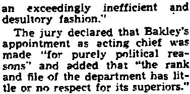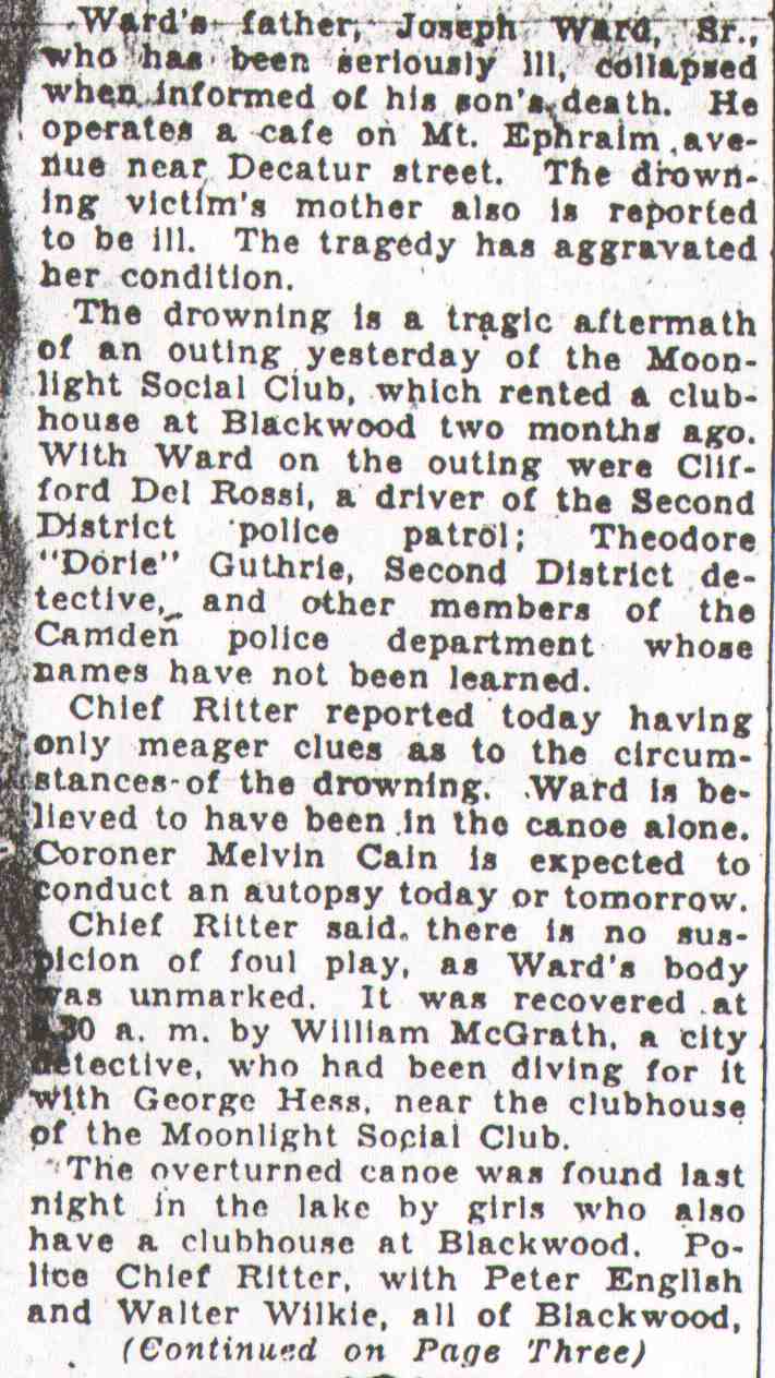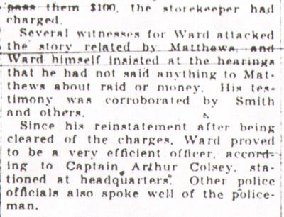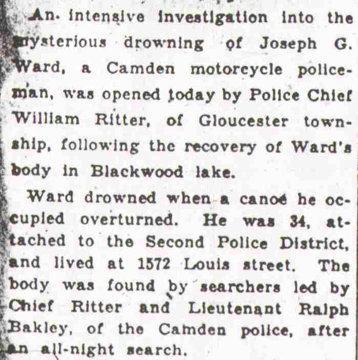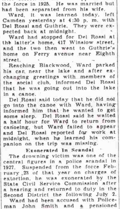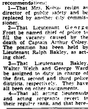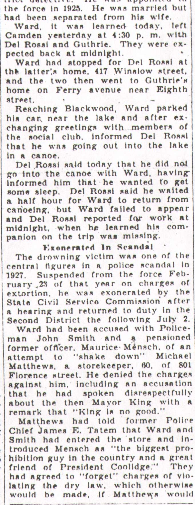 GETS WARD'S JOB AS KOBUS ORDERS COP SHAKEUP SHAW MADE ASSISTANT IN PLACE OF KOERNER In a shakeup of Camden police officials yesterday afternoon Lieutenant Samuel E. Johnson was named acting chief of detectives by Commissioner Mary W. Kobus, director of public safety. Lieutenant George A. Ward, who has been in charge of the detective bureau for a year, was transferred to take Johnson's place in charge of headquarters. Detective Louis Shaw was made assistant to Johnson, replacing Detective Sergeant Gus Koerner. Koerner was transferred to the Second District, for radio car and street duty. The new order became effective at 4:00 PM yesterday Police Chief Arthur Colsey announced the changes in the bureau after a two-hour conference with Commissioner Kobus yesterday afternoon. Maurice Di Nicuolo, who has been an acting detective, was transferred to the First Police District, with former Acting Detective Clifford Del Rossi returning to his old post in the detective bureau. In the only other transfer announced, Sergeant Harry Newton was switched from the First Police District to the Third, with Sergeant Edward Carroll going from the Third to the First. Although no other changes were made public, it is believed yesterday’s are a forerunner of numerous shifts to be made today or early next week.’ “These changes are being made for the good of the service,” Commissioner kobus declared. “There will be other transfers of officers and men so that all the police may familiarize themselves with all the branches of the department.” Lieutenant Johnson was a appointed a policeman on January 1, 1910. After 10 years as a patrolman, he was promoted to a detective, where he made a splendid record. On November 28, 1928 he was made a sergeant, and again promoted on April 8, 1930, when he became a lieutenant. Ward was appointed a policeman on August 2, 1917, promoted to detective January 1, 1927, sergeant November 14, 1928 and lieutenant on January 24, 1930. Johnson was a detective sergeant when former Police Chief John W. Golden was head of that bureau, but later was transferred to police headquarters. Ward has been in and out of the detective bureau several times. He served for a time as the commander of the First District and later was ion charge of the police headquarters on the 12:00 midnight to 8:00 AM shift. He was a political lieutenant of former Public Safety Director David S. Rhone. |