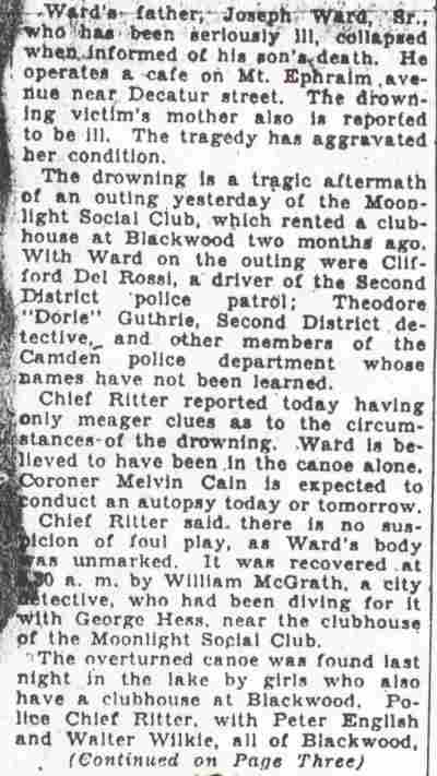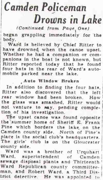 Thomas Who is the legal wife of Howard "Gimp" Thomas, under cover man for Camden police, whose death in an automobile upset early Saturday morning near Ellisburg is being investigated by county authorities? Three women have attempted to claim the body but it still remained in the morgue of Coroner Melvin Cain last night. A mystery woman in black appeared at the coroner's office Sunday and at-tempted to claim it. She declared she was Thomas' wife. "The body has already been claimed by Miss Marie Olive Thomas, 18, Harrisburg, Pa., daughter of Thomas," said Cain. , "Well he is my husband,” replied the woman. "I'm not going to get into any con-troversy over the legal claimant of the body," Cain told her. "You will have to settle that argument with Miss Thomas." Threatens to See Lawyers The woman left in an angry mood and threatened to "see a lawyer." Mrs. Harold Thomas, 6534 Sixth Avenue, Philadelphia, told the Delaware township police yesterday she believes the dead man is her husband, who deserted her two years ago. She said she was coming to Camden to identify the body. She said her husband's name was, Harold and was of the opinion he had changed it to Howard. She said the description she received tallied with that of her husband. Until late last night the woman had failed to visit Coroner Cain's office. The newest mystery in connection with the case, however, has not yet eclipsed that impelling the question: How did 'Gimp' Thomas come into possession of badge No. 188 of the Camden Police Department? The badge, taken from Thomas' pocket when his body was found has been the subject of numerous theories. The police, unable to arrive at a satisfactory explanation, it is understood, are continuing their efforts to learn under what auspices Thomas came into possession of the badge. Captain Arthur Colsey admitted the man had done some work for the Camden police but not often. He has been unable to account for the badge's having the same number as one issued James Hollis, Detective Captain John Golden's chauffeur. Prosecutor Clifford A. Baldwin said he has asked the state police for a report on the death of Thomas and plans to check up reports that four men were with him instead of two on the fatal ride. Harry McClain, 726 Kaighn Avenue, and William Hernisy, 1146 Liberty Street, who were with, Thomas when he was killed, are in the county jail. Two other men, who were reported seated in the rear have escaped. Hernisy was driving the car when Thomas was killed and is being held on a charge of manslaughter and larceny of the automobile. McClain is charged with being an accessory. Both men claim Thomas met accidental death although McClain said the dead man was taking him "for a ride" and he "beat him to it". The pair fled from the scene of the accident because they knew Thomas had stolen the car, they told police.. |