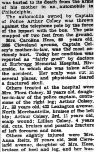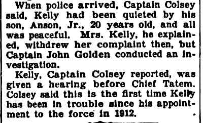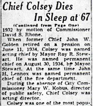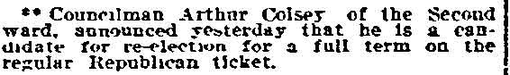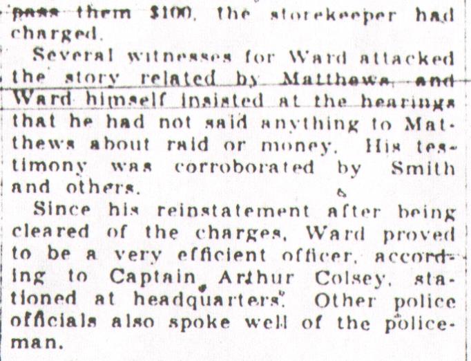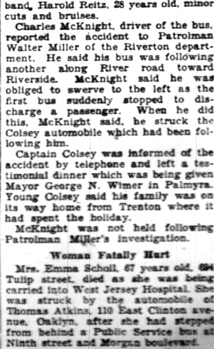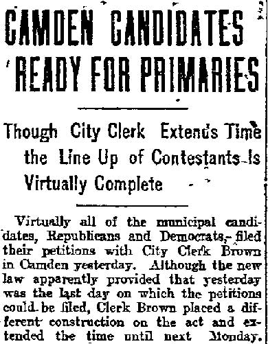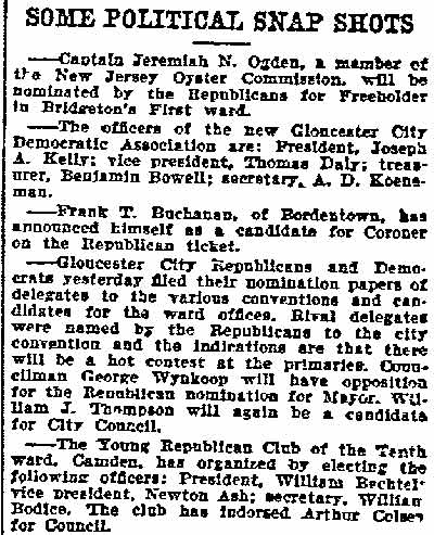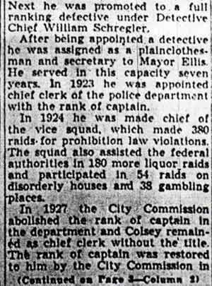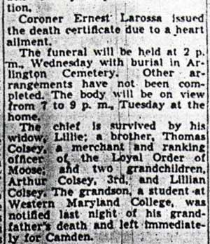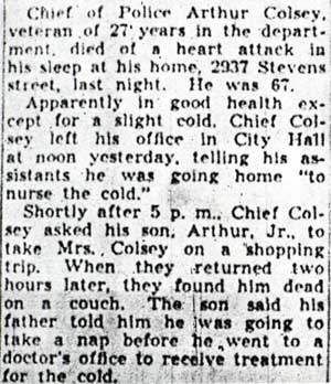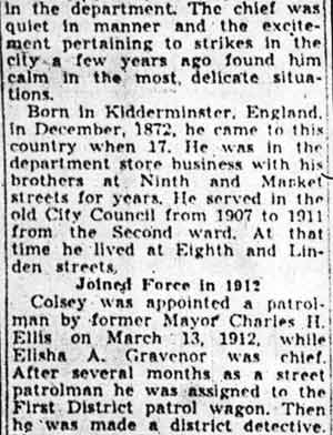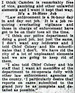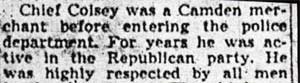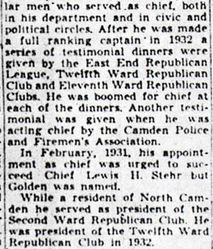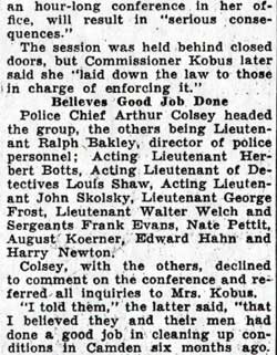 COMPLETES 20 YEARS ON FORCE Twenty years on the Camden Police Force were completed at 9:20 AM today by Captain Arthur Colsey. Many friends and organizations sent baskets of flowers, transforming Captain Colsey's office into a veritable bower of bloom. Many friends dropped in during the day to shake his hand and wish him “good luck”. A card, unsigned, on one of the large wreaths, bears this legend: "Congratulations to Captain Arthur Colsey, for 20 years of faithful service- to the man of men who should have been made chief of police years ago. From an old friend who has been in very close touch with the police department for more than 40 years.” Colsey was appointed a patrolman on March 12, 1912 by E.A. Gravenor, Chief of Police during the te rm of Mayor Charles H. Ellis. H e was driver of the district patrol wagon for a short time, then was appointed a district detective. Shortly afterward he was transferred to the detective bureau under Cap tain William Schregler . Colsey served for seven years in Mayor Ellis' office as a plainclothes detective. In 1923 he was appointed chief clerk with a rating as captain. In 1924, when he was in charge of the voice squad, Colsey made 380 liquor raids, assisted in 180 raids made by Federal agents, raided 54 disorderly houses and 38 gambling establishments. From 1907 to 1911 Colsey was councilman from the Second Ward and served as president of the Sec ond Ward Republican Club. He moved to the Twelfth Ward in 1923, living at 2931 Stevens Street. Colsey will be unopposed for president of the Twelfth Ward Republican Club at the election Tuesday night. |