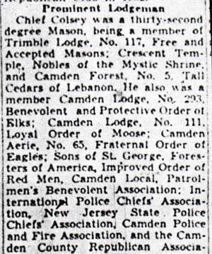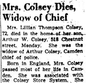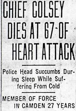 ARTHUR COLSEY was born in Kidderminster, England in December of 1872 to John and Ann Colsey. His older brother, John G. Colsey, had come to America prior to the enumeration of the 1880 Census. At that time he and his wife Ada were living in Philadelphia, and working in the wool industry. By 1887, John G. Colsey had opened a dry goods store in Camden. The store was first located at 6th and Elm Streets in North Camden. This building was later the site of a grocery run by Samuel Molotsky. By 1900 the Colsey Store had moved to 9th and Market Street.. Arthur Colsey followed his brothers to America. Thomas Colsey had come in the 1880s, and was living in Philadelphia and working as a sheep shearer at the end of the 1880s. Arthur Colsey came to America at 17, joining older brother John, and married Lillian Thompson in 1894. Thomas Colsey came to Camden in the 1890s, and the Colsey brothers were in the department store business at 9th and Market Street for years. His niece Alice M. Colsey married Camden photographer George A. Wonfor a few years after the turn of the century. Politically active, Arthur Colsey served on City Council from the Second Ward from 1907 to 1911. In these years and through the time of the 1920 census he was living at 339 North 8th Street, the corner of North 8th and Linden Streets. The Colseys lived next door to James Daly, who operated a tavern for many years at 8th & Linden Streets. Another neighbor was Walter Rowand, who also served for many years with the Camden Police. Arthur Colsey was appointed to the Camden Police Department as a patrolman by Mayor Charles H. Ellis on March 12, 1912. He rose through the ranks and by 1915 was a detective. Although on vacation the night of July 17, 1916, when two prisoners escaped Camden County Jail, killing Turnkey Isaac Hibbs, Arthur Colsey reported for duty, and spent the evening shuttling policemen about the city in his own automobile. Arthur Colsey worked in plain clothes and served as personal aide to Mayor Charles Ellis until his leaving office in 1922. In 1923 Arthur Colsey was appointed chief clerk of the police force, with the rank of Camden. In 1924 Arthur Colsey was placed in charge of Camden's vice squad, not an easy assignment during the Prohibition years. Captain Colsey serving in this capacity in 1925 when the case of Dr. Hyghcock, the "voodoo doctor" of Liberty Street, broke in April, and he was involved in the investigation of Hyghcock's "voodoo den". A longtime resident of North Camden, by 1930 Arthur and Lillian Colsey had moved to East Camden, where they bought a home at 2937 Stevens Street. He joined the Twelfth Ward Republican Club, and was elected its president in 1932. In December of 1931, Arthur Colsey was considered for Chief of Police, to replace Lewis H. Stehr Jr. The position, however, went to John W. Golden. Upon the retirement of Chief john w. golden in june of 1934, Mayor roy r. stewart named Arthur Colsey Acting Chief of Police. His appointment was made permanent on August 30, 1934, along with that of Fire Chief John Lennox. Sadly, a few days later Detective William Feitz became Camden's first policeman to be killed in the line of duty. Chief Colsey worked closely with Commissioner Mary Walsh Kobus when she was elected to Camden's City Commission in 1935 and made Director of Public Safety the following year. In Mrs. Kobus absence, Chief Colsey also served as Acting Director of Public Safety. Arthur Colsey died in his sleep of a heart attack on September 15, 1939. He was survived by his wife, brother Thomas Colsey, son Arthur Jr., and two grandchildren, Arthur L. Colsey and Lillian Colsey. He was buried at Arlington Cemetery in Pennsauken NJ on September 18, 1939. Captain Ralph Bakley was named Acting Chief of Police a few days later. |