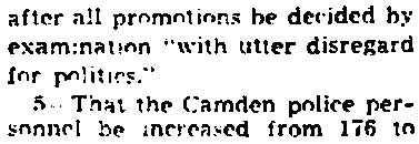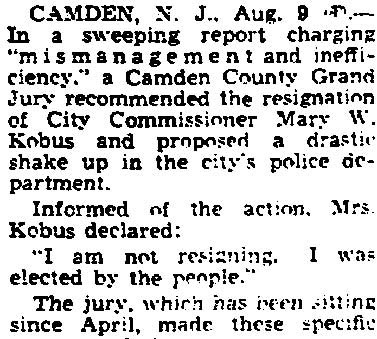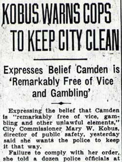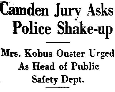 COMMISSIONER KOBUS DECLARES “I want 100% efficient police department and not a political machine.” Commissioner Mary W. Kobus, new director of public safety, made that declaration yesterday afternoon at a joint police-press conference in her office at city hall before she was served with a writ restraining her from taking that office. Commissioner Kobus was the kindly mother talking to her “boys” for the most of the conference- but at times she became the stern parent- with the birchrod in the cupboard- as she instructed the police heads to “divorce themselves from politics.” “For many years I have nursed in my heart a desire to see Camden with a 100% efficient police department”, the commissioner said. “Now that time is at hand.” “I have known all of you men for many years,” she told the assembled commanders, “and I don’t care what your respective political affiliations might be. You have a right to you opinions, but I want the police department to divorce itself from politics. . “You must know what is going on in your city and you must let me know. I must have 100 percent cooperation if I am to succeed in this new undertaking. “If you have any complaints, don’t go around and growl, undermining the department. Lay your cards on the table, I guarantee you a fair deal. “Chief Colsey is head of the police department and not in name only. You others in the rank you occupy are also commanders in fact and not in name. It is up to you.” The commissioner urged a closer co-operation between police and the press and concluded by saying she wanted her “family” to be honest-to-goodness policemen “because there is no room in the department for those who are not.” Attending the conference was Chief Arthur Colsey, Lieutenant Herbert Anderson, chief clerk of the bureau; Lieutenants George Frost, ralph bakley, Walter Welch, Samuel E. Johnson and George Ward. |