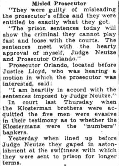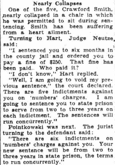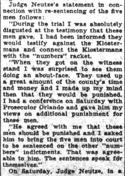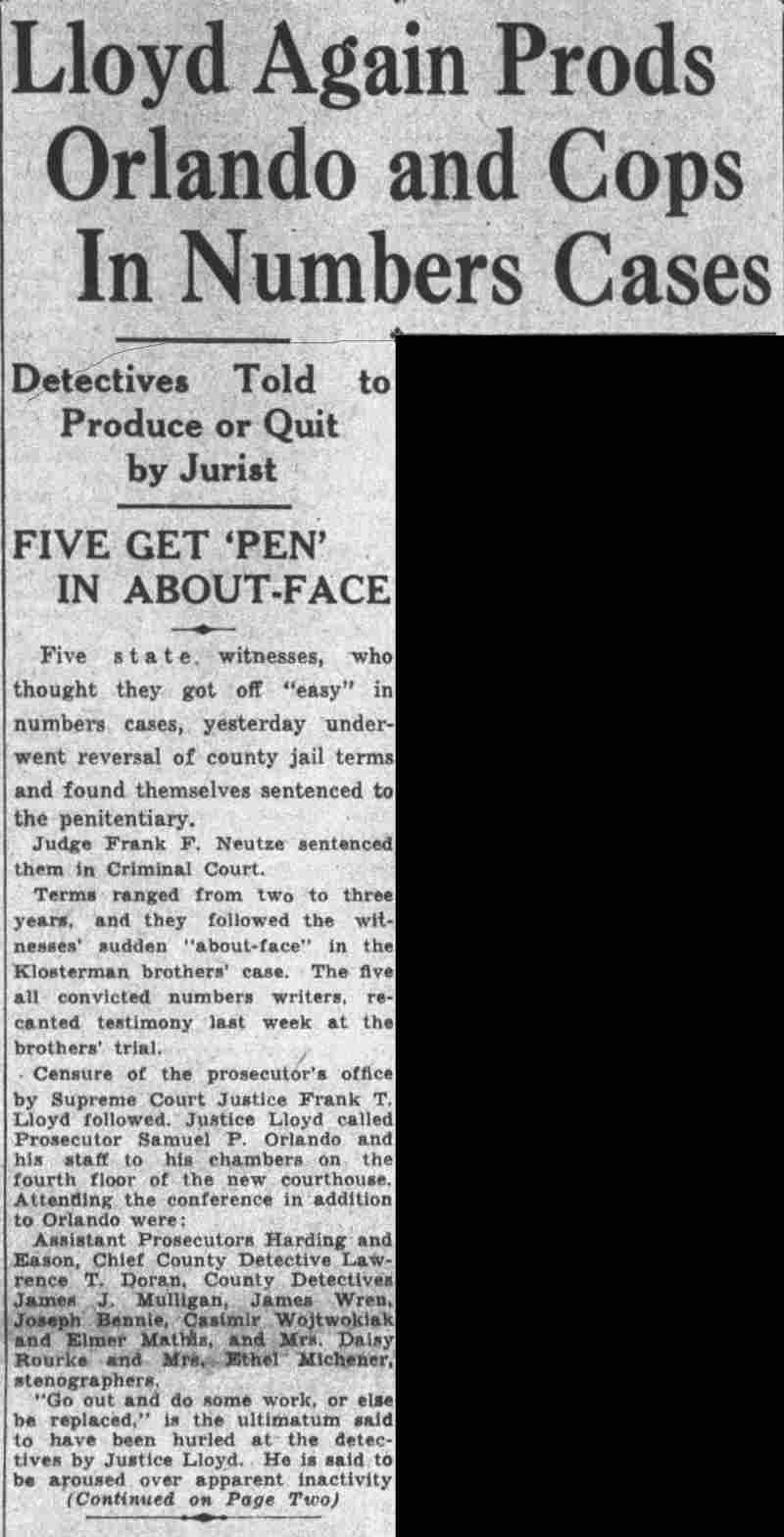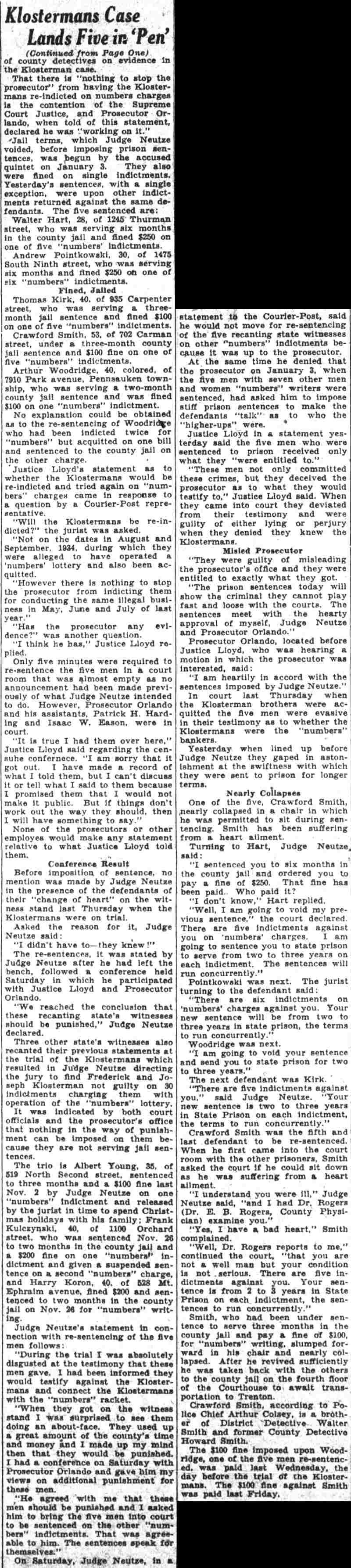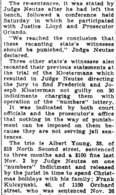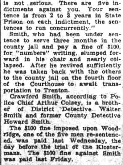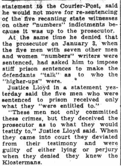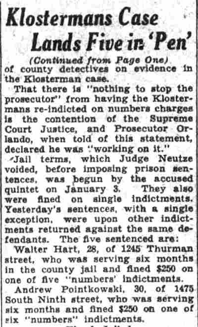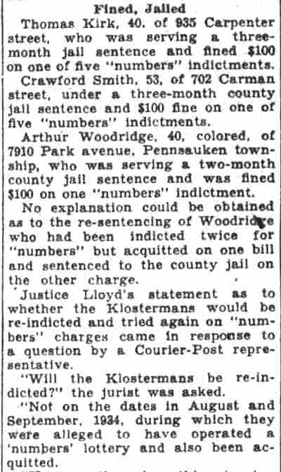 JURY CLEARS NUMBER SUSPECTS Two men alleged by city and county authorities to have succeeded the Klosterman brother sin controlling the Camden numbers racket last Spring, were exonerated by the Camden county grand jury. Those whose cases were “no billed” are Chester “Gassy” Szalinski, 30, of 1188 Chestnut Street, and Joseph Putek, 29, of 2955 Tuckahoe Road. At the same time, the grand jury in its report to the County Clerk Charles S. Wise, failed to find an indictment against Robert Bloodworth, another suspect arrested in connection with the operation of lotteries in Camden. After the trial of the Klosterman brothers, Fred and Joe, both of whom were convicted last spring of number charges, Szalinski was named by Police Chief Arthur Colsey as the “Sixty-ninth Street mobster who had taken over the Klosterman numbers play.” Every policeman in Camden was ordered to arrest Szalinski on sight. The suspected numbers operator was arrested and later released in $1500 bail to await the action of the grand jury. Putek was arrested last April after police had engaged in a sensational chase of 15 blocks after a suspected numbers pickup automobile at which they fired a number of shots, pone of which struck a bystander. Police allege putek joined szalinski in control of the Klosterman numbers game. Arrests of both men climaxed orders to county police authorities by Supreme Court Justice Frank T. Lloyd and Prosecutor Samuel P. Orlando to clean up the number racket in this area. “No bills” were returned by the grand jury for Harry Hartman and John Burke charged with attempts and breaking and entry; J.G. Flynn, accused of being a fugitive from justice from Philadelphia; Ralph Latshaw, Anna Green, and Theodore Jones, statutory charges. Hartman and Burke were held for the grand jury last month on charges they attempted to enter the saloon of Mrs. Mamie Piraine, Republican county committeewoman from the Eighth Ward, at 1944 Broadway. |