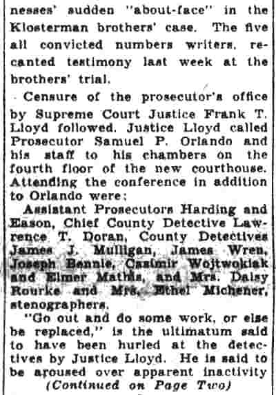 Decision on any action to be taken against Stanley Wirtz, suspended Camden detective charged with having furnished the guns and automobile for a holdup, will be made today by Commissioner Mary W. Kobus and Police Chief Arthur Colsey. Wirtz, with Sergeant Gus Koerner and Detective Clifford Carr, was questioned yesterday, and decision was reserved. Prosecutor Samuel P. Orlando, however, said he would place the case before the grand jury. The charge involved the attempted holdup of the Eavenson & Levering Company payroll, in which one of the alleged bandits was captured at the scene last Friday night. "No charges have been preferred against Wirtz,” Mrs. Kobus announced after the investigation. "And I don't believe any charges will be made," Colsey commented, adding: "Commissioner Kobus and I are going over the reports and statements of all concerned at 10:00 AM tomorrow and a decision will be made then.” Suspended TuesdayWirtz was suspended Tuesday after County Detective Chief Lawrence T. Doran announced Wirtz had admitted supplying the pistols and car, allegedly used in the abortive attempt to obtain a $800 payroll at the wool-scouring plant. Wirtz was still under suspension last night, Colsey announced. William B. Macdonald, court stenographer, recorded the statements made by each man, Koerner and Carr were "planted" in the office of the company before the holdup and frustrated the attempted crime, capturing Walter Lewandowski, 24, of 924 Atlantic Avenue. "All three made full statements to us," Colsey said and then declined to reveal what the statements contained. Denies Stories ClashAsked if there was any conflict between the statements made to Doran and those made to Mrs. Kobus and him, Colsey said: "No, I wouldn't say so." Wirtz appeared briefly before the commissioner and chief at the start of their probe, which was conducted in Mrs. Kobus' office. He left the room after about two minutes and told reporters, sitting outside: "I refused to make a statement. I made one yesterday and that is enough." Mrs. Kobus, however, said Wirtz did not refuse to make a statement but, instead, asked for a little time to consider his statement. "He said he had been In court all day and was nervous,” Mrs. Kobus said. No Charges MadeAsked for a statement at the conclusion of the investigation, Mrs. Kobus said: "No charges have been preferred against Wirtz, This was not a hearing on any charge. This was an investigation of reports which I read in the newspapers. It is the duty of the police officials to investigate any such report, and Wirtz and the other two detectives who figured in the case were called in to make statements. 'This was not, a trial and I do not care to make a statement now about what went on." The suspension of Wirtz came after an investigation was ordered into a statement made by Lewandowski. Lewandowski charged that he had been "framed" by Joseph Powell, a police stool pigeon. He named Powell as the one who "planned the holdup" and, said Powell then informed Wirtz of the plans. Rearrest MadeDoran said Wirtz admitted dealing with Powell and giving Powell two pistols and an automobile for use in the holdup. As a result Powell, who had been arrested and released by city police, was rearrested by the county detectives. In addition, Leonard “Rags” Rogalski, 20, of 1219 South 10th Street, was arrested by the county detectives. They said Lewandowski told them Rogalski originally was intended to take part in the holdup but got "cold feet," and backed out at the last moment. Powell, Lewandowski and Rogalski are held in the county jail. When informed last night of the statements made by Mrs. Kobus and Colsey, Prosecutor Orlando said: "I have nothing to do with the discipline of the police department. I will present the full facts of this holdup to the grand jury and, that body may take any action it desires." Jury to get CaseAsked if he would request an indictment against Wirtz, Orlando said: "I will give the grand jury the full facts. The members will decide for themselves what action to follow." Doran was in conference briefly with Mrs. Kobus and Colsey before the three detectives were questioned. He said he gave them statements made by Lewandowski, Powell and Rogalski, and also by Wirtz. Later Doran returned to Mrs. Kobus' office with a copy of charge of carrying concealed deadly weapons, preferred in 1930 against Lewandowski in 1930, when Lewandowski was 18. This charge was no-billed, Doran said. "He was listed as a mental case," Doran said, "and was examined by the county physician and pronounced O.K." |
