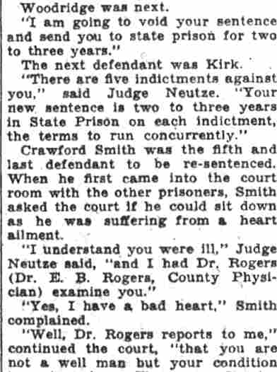 Murdering one jailor and wounding another with a revolver that had been smuggled into them by outside confederates, Wilson T. Ashbridge, slayer of Mrs. Elizabeth Dunbar, and Francis Murphy, alias George E. Thompson, a check forger, made their escape from the county jail a few minutes before seven o'clock last night. Ashbridge with his wife was caught at noon in the Keystone Hotel in Chester PA where they registered at one o'clock this morning. Thompson is still at liberty but from the confident manner of Prosecutor Kraft his early arrest seems assured. The murdered jailor was Isaac Hibbs, aged 65 years of 913 South 8th Street. The wounded keeper is Joseph Ellis, aged 45 years, of 416 Carteret Street. Shot twice, he is in Cooper Hospital. His condition today is very satisfactory. Thompson, who is 41 years old, forged a check for $650 which he gave to V.M. Fulton as part of the purchase price of an automobile. The forgery was discovered before the deal was completed and his arrest followed on June 8. he also passed a forged check for $15 on State Motor Vehicle Agent Kraft. He, too, was awaiting trial. In spite of the positive evidence against him Thompson had spurned all efforts to have him plead guilty and it is now believed that he was sparring for time while hatching a plan to escape. He s no doubt the master mind. R.L. Hunter, a farmer of Bensalem Township, Bucks County PA, about four miles above Torres dale, reported to the Philadelphia police the morning that he had seen a man answering Ashbridge's description on the Bucks Road at daylight. The man asked the way to Riegelsville. According to Hunter, the man was dressed in a dark suit, and had no hat. His clothing was wet. Hunter did not see anything suspicious in his actions, and after giving him directions, they parted. Upon seeing the paper with a picture of Ashbridge, the farmer was struck by its resemblance to the man with whom he had talked. He hurried to Tacony and notified the police. The State police, who patrol that section of the county, and who have an office at Langhorne, were immediately notified as were the surrounding towns. The shootings took place in different parts of the jail. Hibbs was murdered in the exercise room just outside the cell room on the Sixth and Arch corner of the building. Ellis was shot down in the corridor just outside the Market Street end of the building when he heroically grappled with Ashbridge after the latter had pointed a gun at his head. In spite of his wounds Ellis dragged himself to a telephone and after notifying Police Headquarters of what had happened he collapsed. Only one of the two bullets is still in Ellis. It entered the groin on the right side and is buried in the muscles of the leg, having taken a downward course for seven or eight inches. The other bullet struck Ellis in the right breast and came out in the left breast, traversing the upper fleshy parts of the body. Hibbs was almost instantaneously killed by a bullet that went within an inch of his heart, producing a hemorrhage. The bullet was extracted this morning from the body early this morning in an autopsy performed at the morgue by County Physician Stem. In spite of the fact that it is pretty well established that three shots were fires in the attack on Hibbs, only one of the bullets took effect. "But it makes little difference which of the two men handled the gun" said Prosecutor Kraft this morning. "Both are equally guilty of this murder and what we are concerned about now is the recapture of the gunmen." Mr. Kraft added that it his purpose to examine all of the prisoners in that part of the jail where Hibbs was murdered to determine fully who fired the fatal shot. The escape had been carefully planned and timed to the minute. Of course the desperate prisoners were aided by confederates on the outside and it is the general belief that a high powered motor car was in waiting for them not far from the jail. They are known to have been in possession of money and openly boasted yesterday that it was their intention to leave the prison last night. These boasts were made to two young ladies connected with a religious organization who called on the tom men yesterday to offer spiritual reconciliation. The girls are frequent visitors to the jail and naturally their efforts at evangelization were directed in the main toward Ashbridge, because of the fact that he was accused of murder. These girls, whose identity officials will not disclose, were closeted with Prosecutor Kraft until one o'clock this morning. Both declared that on their visit yesterday they were told by Ashbridge and Thompson that it was the last day they expected to spend in jail. "We are going to get away from here tonight and we've got money to help us after we are out " said Ashbridge, who further told the girls he had considerable cash sewed up in the waistband of his trousers. The girls begged the prisoners not to do anything that would cause them more trouble and they told the Prosecutor that Ashbridge and Thompson promised them that they would not make any effort to escape. In their talks with the girls neither of the prisoners said a word that would indicate that they would kill if necessary to escape. The full force of their boast did not dawn on the religious workers and for this reason it never occurred tot hem to inform the Sheriff of what the prisoners had in said. A general jail delivery of at least all the men confined in hat is known as the untried department, where the two were held, was only averted by the prompt arrival of the police on their beat, which was made easy by means of the keys taken from the prostrate body of Hibbs. Ashbridge and Thompson left all of the doors open and the vanguard of the inrushing police found the prisoners swarming all over the corridors on the east side of the prison. In the wild excitement following the double shooting and escape none else thought of freedom and a checking up of the inmates after they had been h