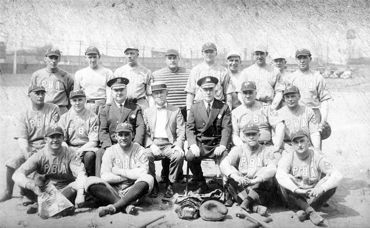 Benevolent Association Baseball Team Public Service Park - Federal Street & Newton Avenue - 1930s Chief Colsey is seated, wearing police uniform, at right PLEASE e-mail Phil Cohen if you can identify anyone in this picture |