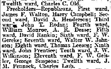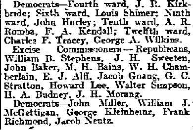Alfred Kemble William Denneler Conrad Brill Jr. Charles Beale Frank Burt Dr. Philip W. Beale Jacob Hess Daniel W. Bromley Frederick Johnson William H. Cole Harry B. Middleton John S.B. Candler George D. Strain Martin McNeil Adolph Peschlow H.J. McNermy L.L. McClennan Henry Price Nathaniel Myers Isaac "Ike" Toy Thomas J. Farnan George Griffin George W. Haman Michael Raidon Thomas Flatley John F. Berton Joseph E. Healey Thomas Dwyler Michael J. Lynch Otto Heydrich |