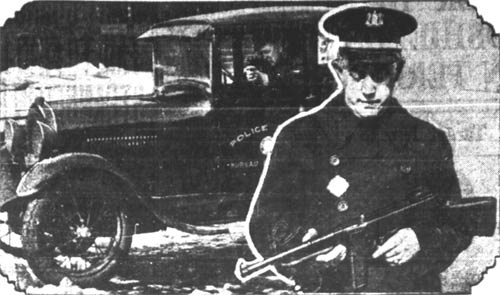 Camden's "Phantom Sniper" had best remain a "phantom" and avoid appearing in mortal form, for the Camden police have a new sort of weapon ready for him. Six machine guns, mounted in new bandit-chasing automobiles, have arrived and were placed in operation today by the police. The photograph shows Arthur Colsey holding one of the guns, at the right. In the background another officer is shown aiming the gun from one of the new "bandit-chasers". |