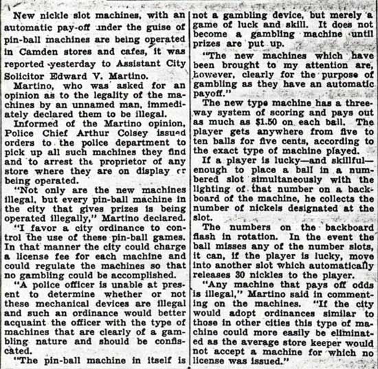 Hall Owners' Told Gaming Will Cost Permits Operators of pool and billiard-halls were warned yesterday by Commissioner Mary W. Kobus, director of public safety, that permanent revocation of licenses will be the penalty if gambling is permitted on the premises. Commissioner Kobus said she has been investigating reports that some poolroom licensees have been operating card games for large and small stakes in backrooms of their places. The investigation, the commissioner said, failed to disclose any large gambling enterprises but a few friendly card games for small stakes were revealed. "1 will issue an order to Chief Arthur Colsey and all district lieutenants and sergeants that a closer watch be kept on these so-called poolrooms," Mrs. Kobus said. "In days past the average neighborhood room was only a blind for professional card games where the participants played for large stakes. "Such licensed poolroom operators are amenable to the law, and if they are caught they will be charged as principals and their licenses will be permanently revoked. I will not accept the excuse of any proprietor that he doesn't know there is gambling in his place." 'Majority Law-Abiding' The Commissioner said she believes the majority of persons holding pool room licenses are law-abiding and that pool and billiards are played for recreation. It was disclosed by Mrs. Kobus that a former operator of a down town poolroom, whose place was raided as a gambling resort, has been exerting political pressure to obtain a renewal of his license. Mrs. Kobus would not disclose the identity of the man mentioned by her. "Any Camden citizen who wants a license to operate a poolroom where pool and billiards are to be played does not need to get the help of a politician or a lawyer," Mrs. Kobus added. "I am not running the department of public safety to satisfy the whims of any politicians or lawyers. No Lawyer Needed "Any respectable citizen can have a license. He doesn't have to pay a lawyer to help him get it, and neither does he have to depend on any politician. "The applicant who attempts to support his application either with a lawyer or a politician will find him self behind the eight ball." Commissioner Kobus said each applicant for such a license will be examined as to his fitness to operate such a place. Those who have any criminal record will be denied such permit, she said. "It might be a good thing if certain forms of gambling were legalized and revenue obtained for municipalities, the State or by the government," Mrs. Kobus stated. "But so long as the law specifically states that gambling is Illegal I intend to enforce the laws. I personally am opposed to all forms of organized or commercialized gambling. |