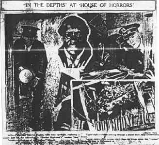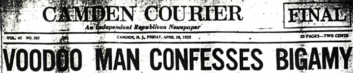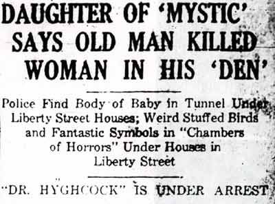 Discovery of the body of a white baby several weeks old, human bones and other gruesome articles in a maze of dungeon-like caves and sub-cellars under 413 and 415 Liberty Street today have led the police to hold without bail "Doctor" H.H. Hyghcock, 71 year-old negro preacher, medicine man and undertaker. The weird discoveries were made in the fantastically furnished "torture chambers" and "witch caves" under the houses. In addition statements made to Patrolman Charles Naylor and a Courier reporter by a seven-year-old daughter of the accused man, point to a possibility of a woman having been murdered in the place only last week. "Weirdest Ever" Says Tempest The labyrinth of underground passages and chambers discovered under the houses is declared by Deputy Director tempest to be the "strangest and weirdest layout" he ever has visited in all his long career in police work. Twisting and narrow underground passages and half-buried doors in almost inaccessible portions of the underground passages led to a belief that many more chambers remain for the police to enter in their underground exploration. Deputy tempest has ordered that a complete search be made of every corner of the cellars and sub-cellars and that if necessary the two houses above be torn down to make examination possible. The earth of all the cave floors is being dug up by the police in search of further clues. Bone of Forearm is Found The white baby's body was found shortly before 1:00 PM today, lying in a large glass jar in one of the sub-cellars. What is believed to be the bone of a child's forearm had been found in one of the passages a short time before. In another glass jar the police found what they report to be a human stomach. To count the rooms, or divisions, of the many underground passages is impossible, because of the irregular arrangement, up and down and in all directions. Some of the policemen engaged in the exploring task have estimated there are more than 75 different compartments. Second Arrest is Made While the police were exploring the place shortly after noon a colored man walked into the Liberty Street entrance and started down the tunnel leading to the underground chamber as if he were well acquainted with the place. Arrested and taken into police custody was Louis Reeves, 23 years, 1061 Ivins Street. he had been employed as a chauffer to drive the voodoo doctor's automobile, he said, and he had been accustomed to visiting "Doctor" Hyghcock daily and being given a bottle of soda water. That was the only purpose of his visit today, he declared, and he disclaimed any knowledge of the activities of Hyghcock. The little daughter of the "proprietor" of the strange "place of horrors" made her hair-raising statements while being questioned in regard to her father's recent activities. "Shot a Woman"- Took Her Away "How many people has your father killed here?" she was asked. "He never killed nobody until last week" she replied with childish frankness. "Then he shot a woman, and he took her away in her automobile at night." In his cell at City Hall, Hyghcock maintains an air of mysterious silence. He is of an impressive personal appearance. although below medium height, he has a proud bearing, made more compelling by his white hair, mustache and imperial. He has boasted to acquaintances that he is the father of 32 children. Bootblacks tell of him giving 50 cent tips. hyghcock was arrested last night when he appealed to police, demanding a warrant for an unknown thief about whom he told a weird tale of threats to return and kill him. Hyghcock styles himself a clergyman, physician, an undertaker, a real estate operator, a clairvoyant, a palmist, and a fortune teller. hyghcock was held on $500 bail early today on the charge of obtaining money under false pretenses and in an equal amount on the charge of practicing medicine without a license when arraigned before Police Judge Cleary this morning. He could not raise the money and was held in jail. Then, when the other discovered were made, he was held without bail. A visit to his place by the police led to the exploration of the intricate series of underground chambers. They were separated by swinging doors operated by mechanical springs. Some of the cave-like dungeons contained weird contraptions, like ancient machinery of torture, believed to have been used in connection with "cures," is to which patients of the voodoo man were terrified. Patient Believes In Him Besides Hyghcock police arrested as material witnesses Mrs. Bipp Hyghcock, 43 years old, aid to be his wife, and Mrs. Lotte Ingram, also a negress, 43 years old, of 59 North Peach Street, Philadelphia. Mrs. Ingram, who was found in the house at 413 Liberty Street, aid she was there to receive treatment for heart disease from Hyghcock. In a statement to Detective Hunt, Mrs. Ingram said she gave Hyghcock 25 as part payment for the cure of her disease, and that she had been visiting his house for several months. Upon questioning she revealed further that Hyghcock had given her herb medicines, adding that she had faith in his powers and believed she was being healed. hyghcock has no license to practice medicine, police say. The revelation of the startling interior of the place and the practice of hyghcock, at the Liberty Street houses, both of which were rented by him, was brought about when the "doctor" inquired for a magistrate to issue a warrant for a Philadelphia man who, he said, stole some automobile tools from him and threatened to return to slay him. Hyghcock made the first inquiry of Howard Westsell, 797 Mt. Vernon street, who was standing at Railroad and Kaighn Avenues t 6:00 o'clock last night. Westsell referred him to Howard Fisher, a negro policeman of the Second District, who approached the two. Cops Take Him Home Fisher, becoming suspicious, questioned Hyghcock, who became evasive and insisted that the officer could not aid him. Fisher placed him under arrest, summoned Policeman James McTaggert an