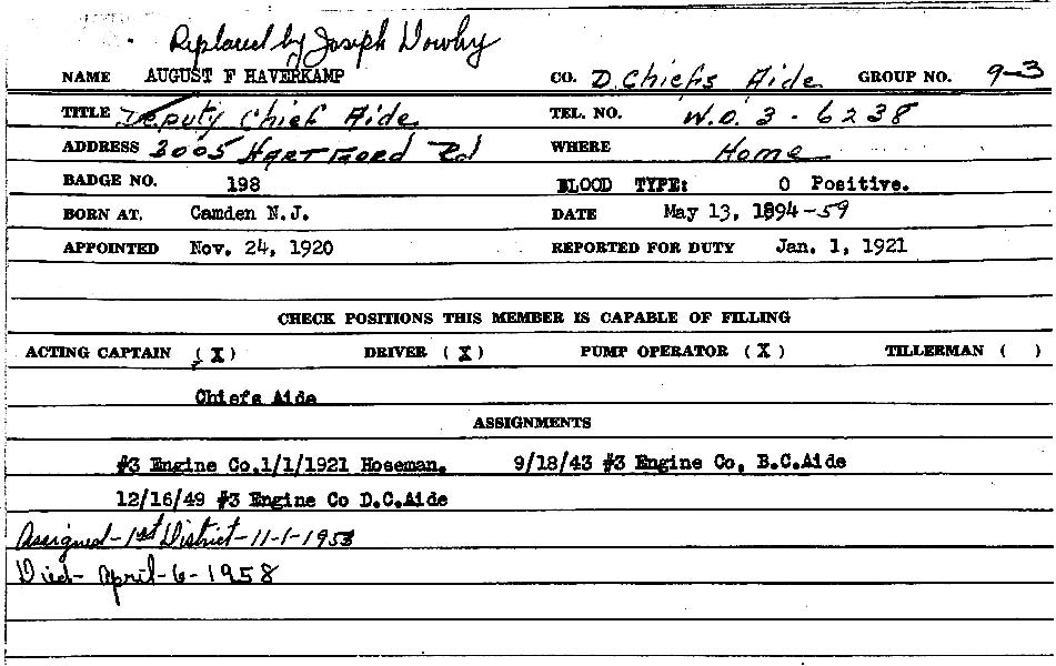 The 1900 Census shows August Haverkamp and his sister Emma residing with their mother, Lizzie Haverkamp, at 575 Van Hook Street. Also residing at the residence was a roomer, Morris Jeitner, who worked as a shoemaker. August Haverkamp appears in the 1914 City Directory, still at 575 van hook street. He was working as a plumber. He was still single and working at the Castle Kid Company, a leather manufacturing business, when he registered for the draft on June 5, 1917. August Haverkamp was then living at 573 Van Hook Street. His draft card indicates that he was taking care of his father, apparently his mother had remarried at some point, but was now gone. He married about that time, and served in the armed forces during World War I. Returning from the war, August Haverkamp found work as an electrical worker at the New York Shipbuilding Corporation shipyard. When the Census was taken on January 5, 1920 August Haverkampf was boarding at 1645 Broadway, the home of long-time Camden Fire Department member Francis D. "Frank" Chambers, who served at the nearby Engine Company 3 firehouse at 1813 broadway. August Haverkamp was appointed to the Camden Fire Department on November 24, 1920. He reported for duty on January 1, 1921 with Engine Company 1 at 409 pine street. On September 18, 1943 he was re-assigned as Battalion Chief's Aide for the Third District, based at Engine Company 3's firehouse at 1813 Broadway. August Haverkamp held this post until November 1, 1951 when he was transferred to the First District where he served in the same role. The 1924 and 1947 Camden City Directory shows that August Haverkamp and his wife Ella lived at 1723 South 6th Street. A daughter, Julia, was born around 1927. The 1947 Directory shows daughter Julia Haverkamp, a bookkeeper, also resided at that address. By October of 1956 August Haverkamp had moved to 3005 Hartford Road in Fairview. August Haverkamp was still a member of the Camden Fire Department when he passed away on April 6, 1958, at the age of 63. He was replaced on the Fire Department by Joseph Dowhy Sr. |