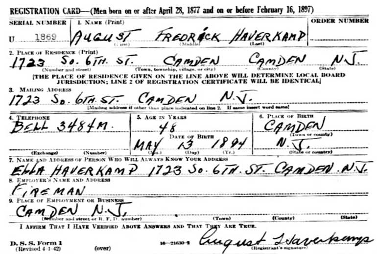FREDERICK HAVERKAMP was born on May 13, 1894 in Camden, New Jersey to