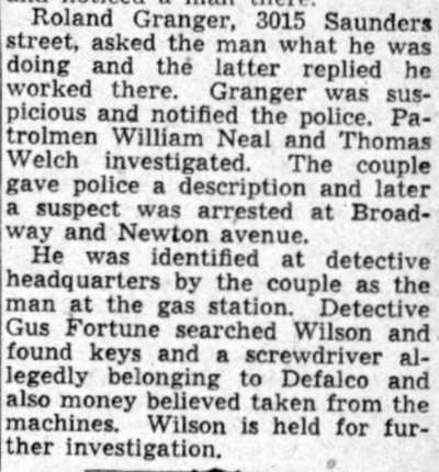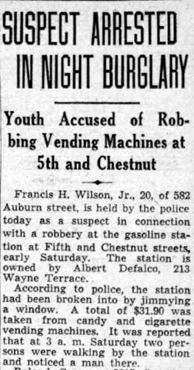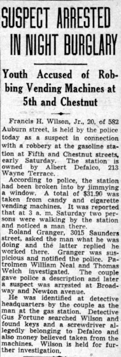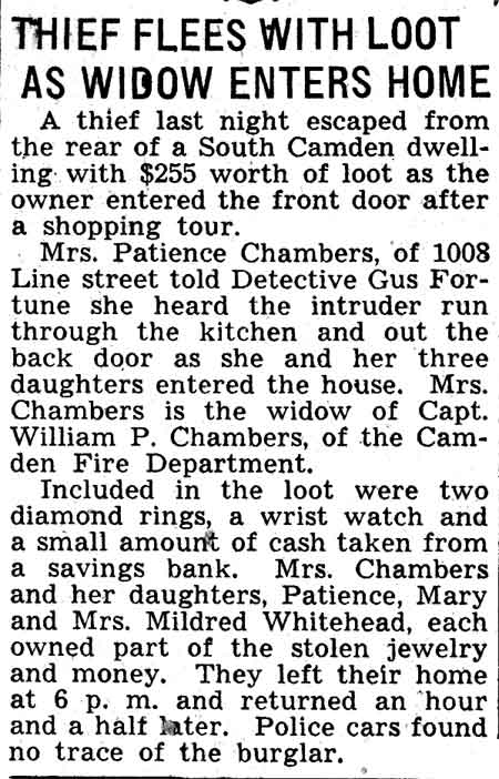 BURGLAR GETS $65 While Walter Wilson and his wife were attending a movie yesterday afternoon, a thief ransacked their home at 1025 Morton Street and stole about $65. Wilson reported to detective bureau. Detective Gus Fortune said the burglar entered through the cellar and pried open the kitchen door. Wilson said $12 was taken from a pair of his trousers; $50 from a chest and one dollar and some change from a small bank.. |