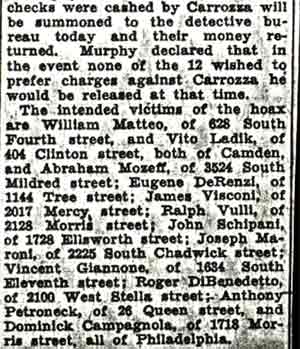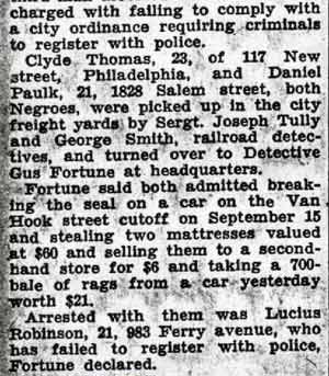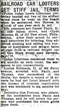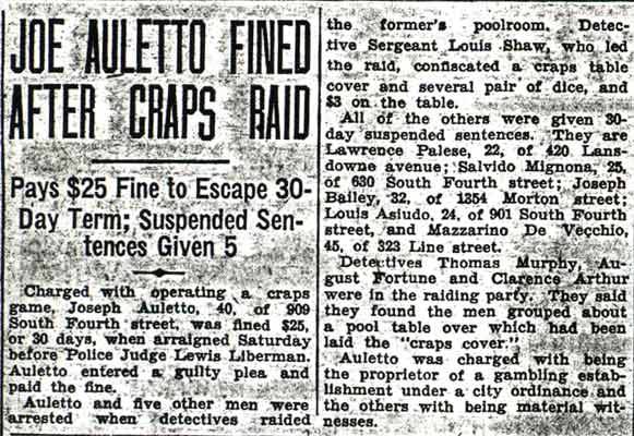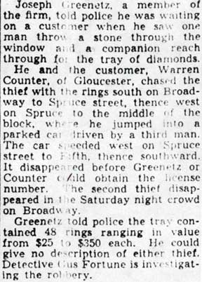 THREE MEN NABBED IN NORTH CAMDEN ROW Three young men were found guilty of disorderly conduct in police court this morning when they were charged with creating a disturbance In front of a restaurant near Sixth and Market streets. Fiore Rossi, 23 years old, 329 Mickle Street, brother of ‘Pee Wee’ Rossi, local pugilist, was sentenced to 60 days in the county jail. Thomas O’Neill, 22 years old, 204 Berkley Street, was fined $20 and sentence was suspended on John Develin, 21 years old, 1002 Penn Street. Rossi was charged with severely beating August Fortune, a policeman assigned to special duty at the restaurant. Patrolman Fred Mueller testified that at 3:30 o’clock Sunday morning he had told the men to “move on” from Fifth and Market Streets when he found them creating a disturbance. The men walked away and in front of the restaurant again became boisterous. Moeller and policeman Marshall Thompson then arrested O’Neill who had become “sassy”. The other two objected to the arrest, and when Fortune came from inside the building to assist his brother officers, he was struck in the face and knocked down by Rossi. The three succeeded in taking the men to headquarters. Rossi this morning admitted hitting Fortune but said he did not know he was an officer and “thought he was a wise guy trying to go big with a woman’. |