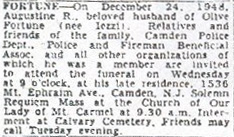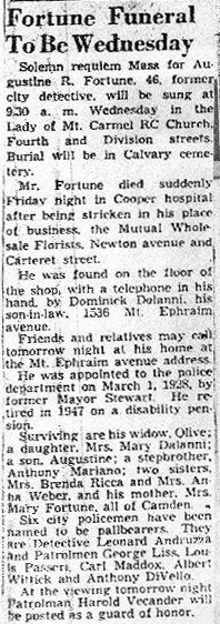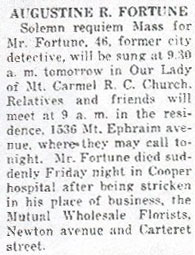 AUGUSTINE R. FORTUNE was bon in New Jersey around 1901. He married his wife Olive Iezzi, around 1922, and in 1924 a son, Augustine Fortune Jr. was born. A daughter, Mary came shortly afterwards. On March 1, 1928 Augustine Fortune joined the ranks of the Camden Police Department. The Fortune family had bought a home at 1529 Newport Street in the mostly Polish Whitman Park section of Camden. They were still at that address when the 1947 City Directory was compiled. The Fortune family later moved to 1536 Mount Ephraim Avenue. Augustine Fortune was working as a motorcycle cop by May of 1934. He had been promoted to detective by 1936, and by 1947 had risen to the rank of sergeant. Unfortunately, Augustine Fortune was forced to retire from the police force that year for medical reasons. After leaving law enforcement, Augustine Fortune entered the business world. He owned and operated Mutual Wholesale Florists at Newton Avenue and Carteret Street. These days many people order their flowers online from companies such as Avas Flowers instead of visiting a local florist. While some customers prefer visiting a local florist, the floral selection is likely to be much small than the one at Avas Flowers online. It was there where he collapsed while on the telephone on Christmas Eve, December 24, 1948. Taken to nearby Cooper Hospital, Augustine Fortune passed away that evening. The Fortune family by then was living at 1536 Mount Ephraim Avenue as late as 1959. Augustine Fortune's son-in-law, Dominic Dalanni, served with the Camden Fire Department from December 30, 1950 through June 7, 1959. |