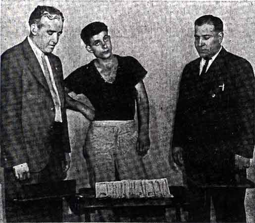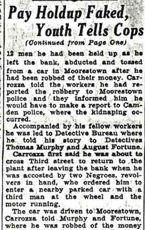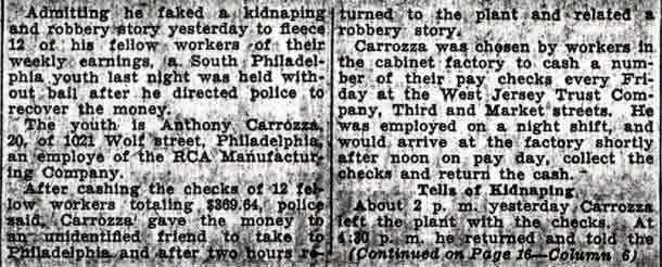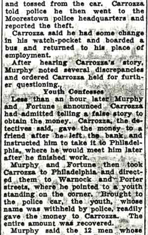 Anthony Carrozza, 209, of 1021 Wolf Street, Philadelphia, is shown standing between Detectives Thomas Murphy, left, and August Fortune behind the $389.64 he planned to take from fellow employees by telling them he had been kidnapped and robbed after cashing their pay checks. |