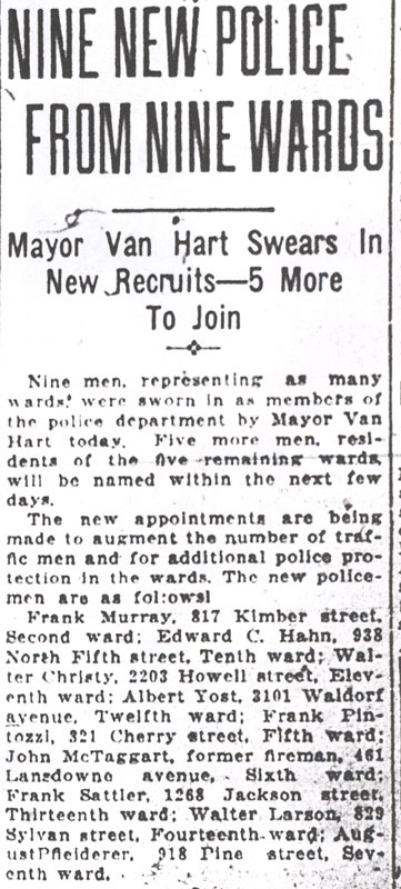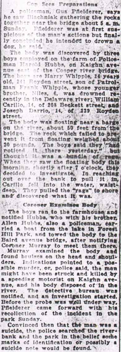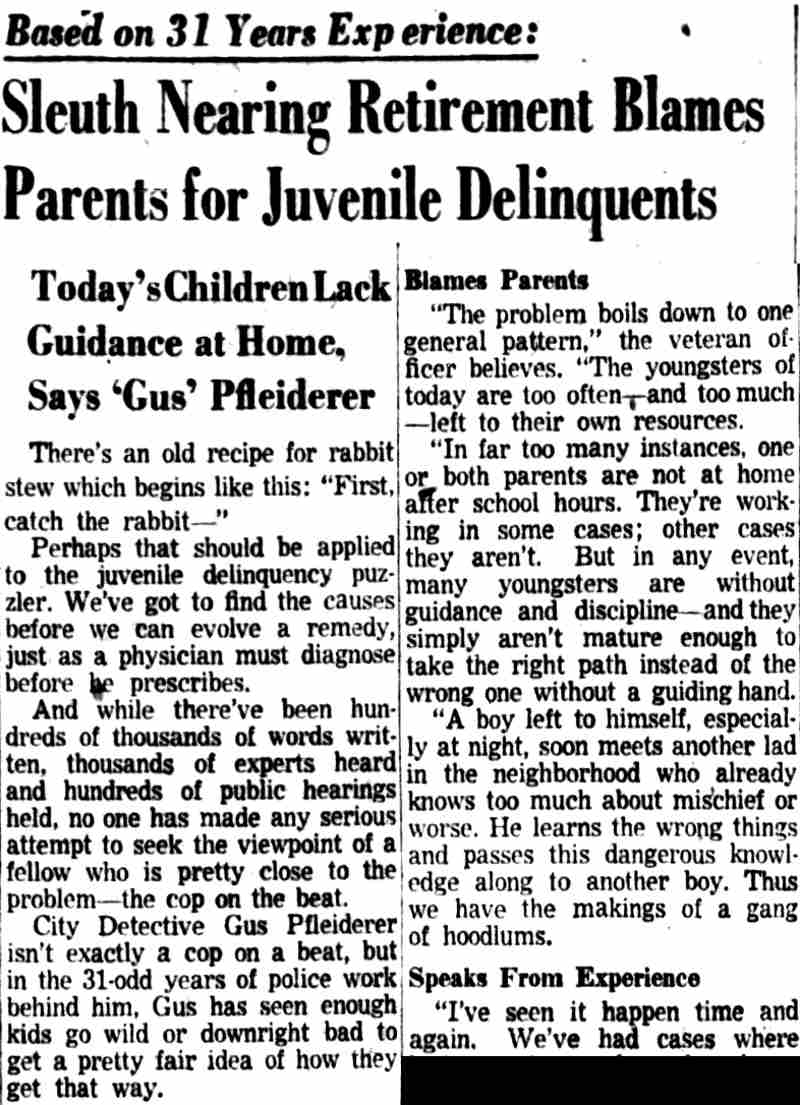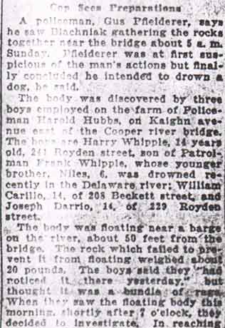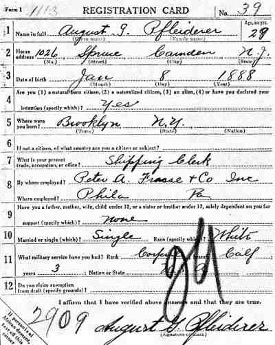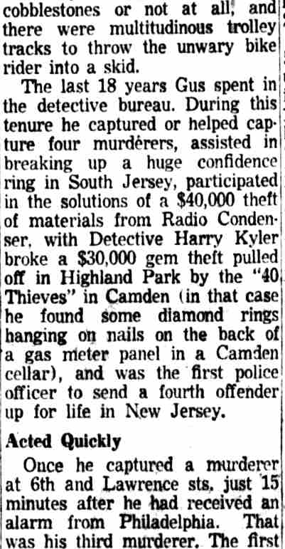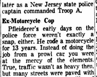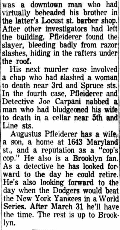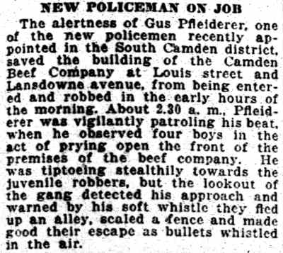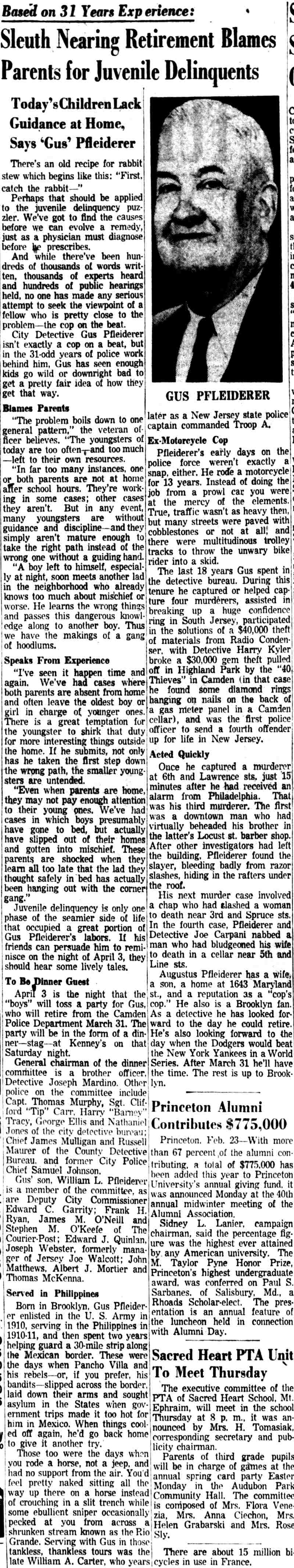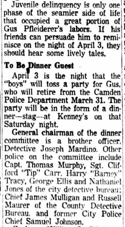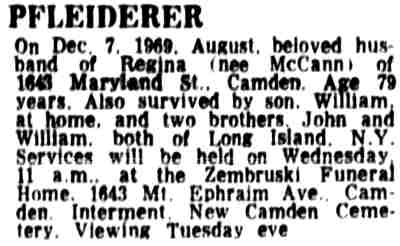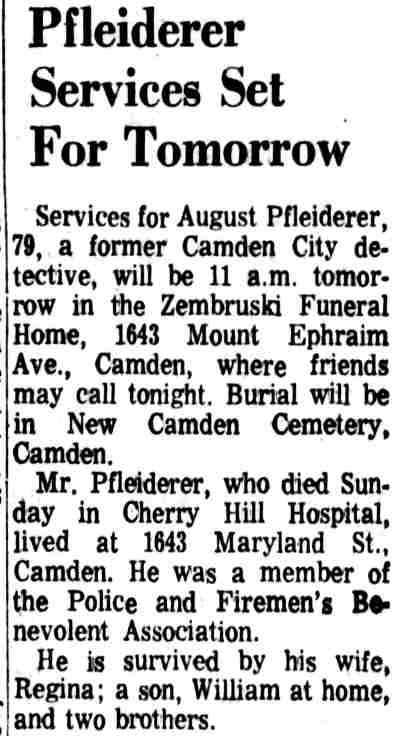 Department for many years. August Pfleiderer served with distinction for over three decades, retiring in the spring of 1954. He died on December 7, 1969 and was buried at New Camden Cemetery. He was survived by his wife and son, William. |