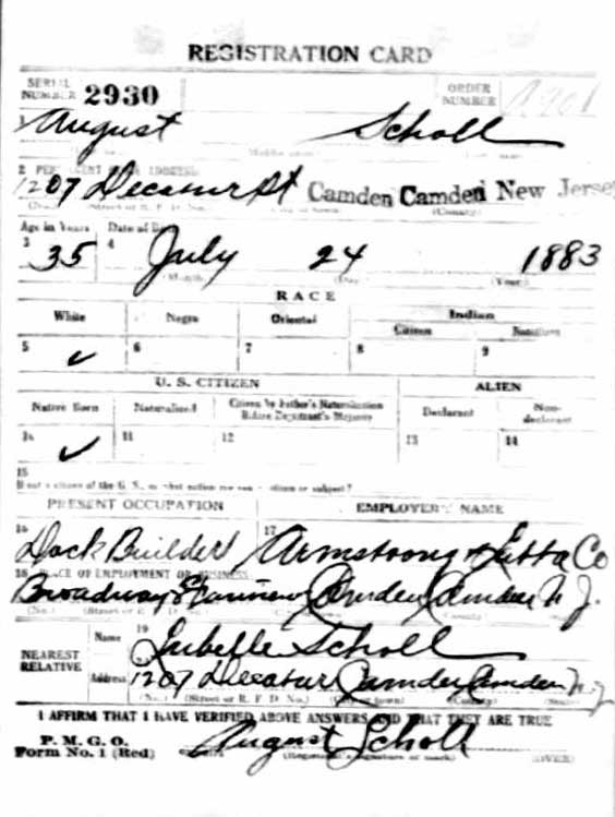 Draft and census records from these years give his occupation as carpenter and wharf builder. By the end of 1923, however, August Scholl had been appointed to the Camden Fire Department. August Scholl is not listed in the 1927 or 1929 Camden City Directories, or the 1930 Census. By 1931 he was living at 334 West Plymouth Street in Inglewood, California. August Scholl passed away in California on April 24, 1945. |