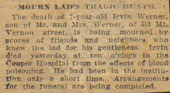 August Werner founded a moving and storage business in 1897. When he passed away in the 1930s his son William carried the business forward. His widow, Anna Werner, was living at 523 Berkley Street as late as the fall of 1959. |