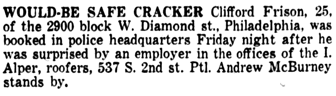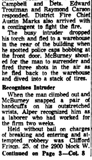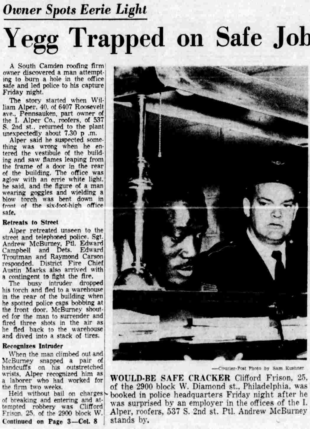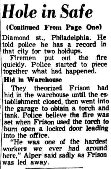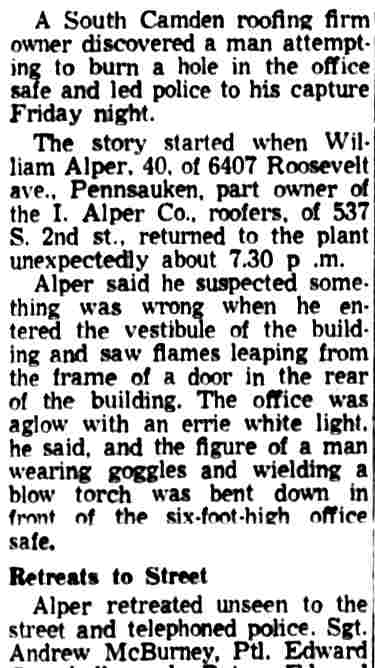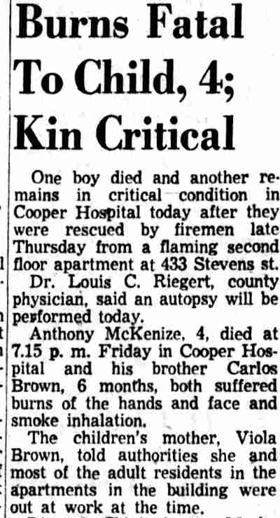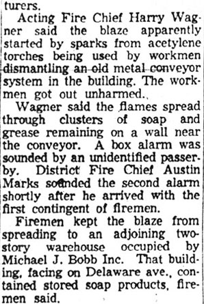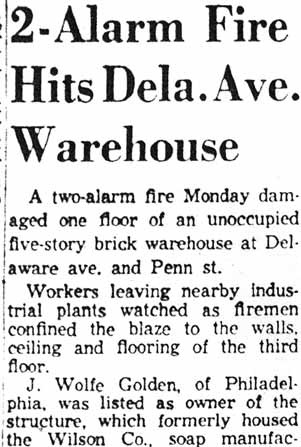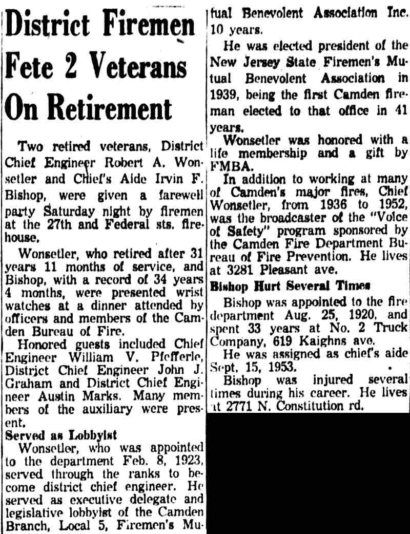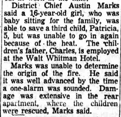 By Fredrick Smigelski and Charles Q. Finley A fast moving fire fanned by a bitterly cold wind destroyed three buildings in South Camden last night, left one fireman dead, two others injured, and nine persons homeless. As dense smoke, chunks of flaming debris and showers of sparks spewed high into the night, the roaring blaze wrecked Walmart Tailors, Inc. at 1101 Broadway and two floors above the store used as an apartment house, the Style Nook Dress Shop at 1103 Broadway, and Jean's Hosiery Shop at 1105 Broadway. With only seconds to spare, Police Sergeant John Ferry and Patrolman Alfred Hayes entered the 1101 building and led the occupants, many of them elderly, to safety as flames mushroomed from the basement toward the roof. Eleven pieces of equipment were still at the scene this morning. Captain Dies Fire Captain leonard iannelli, 41, of 3055 Stevens Street and attached to Truck Company 2, collapsed at the scene. He was dead on arrival at Cooper Hospital of an apparent heart attack. Fire District Chief Frank Deal, 39, of 412 North 37th Street, was treated at Cooper Hospital for smoke inhalation.John Yates, 63, of 2400 South 8th Street with Engine Company 2, was treated at West Jersey Hospital for smoke inhalation and a back injury. Among those made homeless by the fire were Claude W. Darnell and Mrs. Carey Morgan, both 80; William Schaffer, 77; and Charles Hill, 67 and his wife who is 62; Mrs. Frances Matthews, 53; Helen Saltzman and James Early. Iannelli was standing on Broadway next to Lieutenant Colonel William A. Gwynne of the Volunteers of America, a chaplain, who was serving coffee and food. District Chief Theodore Primas gave mouth to mouth resuscitation on the way to the hospital. Coroner Schaffhauser was notified. He said Iannelli died either from a heart attack or smoke inhalation. The possibility of an autopsy was being discussed this morning. Police Aid Elderly Iannelli's brother, Carmen, is with Engine Company 9 and was on duty on the time but not at the fire. He went to the hospital when told of the tragedy. Ferry and Hayes were first on the scene after the alarm was sounded at 6:03 by a nearby merchant. They entered through a back door and ran upstairs to the second floor where they kicked in doors, rounded up the confused occupants and got them out safely. They then went to the third floor and found Early and Darnell. The fore spread rapidly and soon huge balls of flame were pouring from the windows as burning frames fell to the pavement. Chairs, a shower fixture, a mirror on a wall, could be seen briefly through the windows in the mass of flame inside, then they fell into the inferno. The roof collapsed, then sections of the third floor wall on the Chestnut Street side began falling into the fire. Firewall Credited Smoke filled Schrack's Paint Store at 1107 Broadway and a firewall was credited with helping to save John's Bargain Store at 1109-1111 Broadway. Firemen carried a hose to the roof of the Camden Roofing Supply Company on Chestnut Street to the rear of the fire. At one point a half dozen streams of water were being poured into the flames as they burned furiously on one side of a small alley which separated the roofing company from the fire. Harold Walter, owner of Walmart Tailors, Inc. was trying to get his car out of a snow bank nearby when the fire started, He gave firemen keys to open the gate he had just closed across the front of his store. Fire Chief Edward MacDowell said the blaze had apparently started in the basement of 1101 Broadway but no cause had been determined immediately. Fireplugs Froze Engine Companies 8 and 1 and Truck 2 responded to the first alarm with District Chief Theodore Primas. The second alarm was sounded at 6:10, bringing Engine Companies 3 and 7, and Truck Company 1, Rescue Squad 1, District Chief Deal and Deputy Fire Chief Austin Marks. At 8:02 Engine Company 2 was summoned and at 8:45 35 off duty firemen were called to relieve firemen exhausted by the cold. The spray from hoselines covered streets and equipment with sheets of ice. When firemen arrived they found fireplugs frozen and had to use heaters to get the water flowing. Police held back large crowds which gathered despite the cold and wind. The fire burned out of control for six hours and was not declared under control until midnight. The area was closed to traffic during the fire. Traffic this morning was detoured off Broadway between Mt. Vernon Street and Kaighn Avenue. Wind Shifted Primas said there was a west wind when the fire broke out but that it shifted to the north, during the flames into the buildings to the south. Iannelli is survived by his wife Olga, two sons, Leonard Jr. and Dennis, and a daughter, Mary, at home; his mother, Mrs. Rose Iannelli, of Camden; and two brothers, Carmen and Frank of Camden. Iannelli's late father, Frank, was a firemen 21 years and died of a heart attack after fighting a fire in April of 1942. Iannelli joined the fire department in March, 1948 and was made captain four years later. He was a veteran of World War II. Because of the large amount of stock involved, the extent of the damages were not immediately known. |