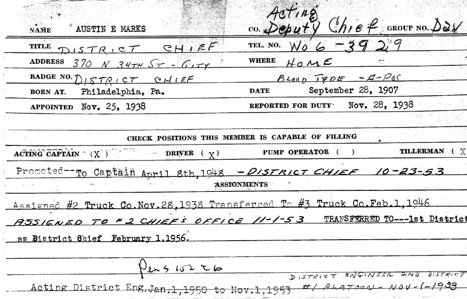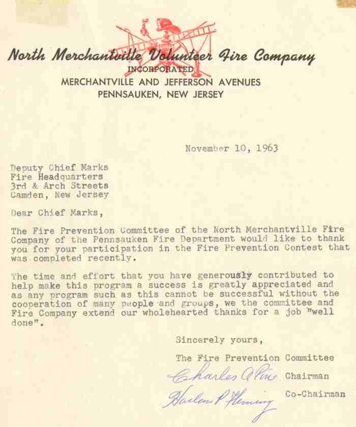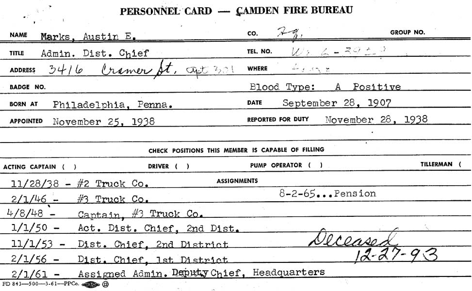 On the bitter cold night of January 14th, 1964, as members were standing roll call throughout the firehouses of the City, Box 328 tapped in for Broadway and Chestnut Street at 6:02 P.M. Engine Company 1, Engine Company 8, Ladder Company 2 and Chief Theodore Primas of the 3rd Battalion responded. Arriving units found heavy smoke pushing from the first floor of Walmart Tailors, a three-story building with apartments above. Police had already led nine occupants to safety before the arrival of the fire fighters. Engine 8 stretched the first line while Ladder 2 was ordered to force the door. Moments later, the plate glass windows failed and the store front lit up in a ball of fire. Chief Primas transmitted a second alarm and ordered the deployment of master streams. The fire extended to all floors of the building and broke through the roof as bitter cold winds whipped the flames out into the street. Extreme icing upon ladders, apparatus and streets surfaces made for treacherous operations. Deputy Chief Austin Marks who responded to the second alarm, special called an additional engine company and further ordered the recall of 35 off duty members , directly to the fire for relief purposes. As conditions deteriorated, a third alarm was transmitted to reinforce relief operations. Shortly after the third alarm, Captain leonard iannelli of Ladder Company 2 - the first due truck, collapsed on the sidewalk from a heart attack. Brother firemen rushed to his aid and Battalion Chief Primas personally attended to the unconscious officer. In the ambulance while enroute to the hospital, Chief Primas performed mouth to mouth resuscitation all the way. In spite of these efforts, Captain Iannelli was pronounced dead at the hospital. By this time, the fire had destroyed most of the building as the roof collapsed on to the top floor causing some wall sections to fall into Chestnut Street. Fire fighters concentrated their efforts on saving the adjoining Camden Roofing Supply Company. At one point a half-dozen master streams were directed into a narrow alley that separated the roofing supply from the fire building. Units were successful in protecting this exposure and firemen were also credited with saving the huge John's Bargain Store just a few doors down from the fire. Following a six hour battle, the blaze was controlled shortly before midnight although companies would remain at the scene for over 24 hours. On the following morning, the scene resembled an ice palace as firemen used axes and halligan bars to pry frozen hose embedded in thick street ice. Like his father, Leonard Iannelli died in the line of duty as a Camden fire fighter. Tragically, Captain Iannelli's brother, Carmen Iannelli would also give his life while protecting the City of Camden, in 1975. |