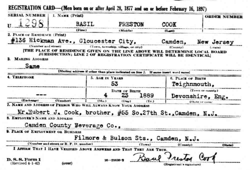 BASIL PRESTON COOK was born in England. He got into the bar business during Prohibition and had a few scrapes wit the law. In 1932 he was running a bar at 939 South 5th Street. By 1942 Basil Cook was working as a salesman for Camden County Beverage Corporation, the firm that owned and operated the Camden Beer brewery at South 6th and Bulson Streets. Still employed by the brewery, Basil Cook was on a leave of absence from his job when he collapsed while shoveling snow outside of his home at 307 North 2nd Street on February 15, 1958. He was pronounced dead on arrival at Cooper Hospital.. |
