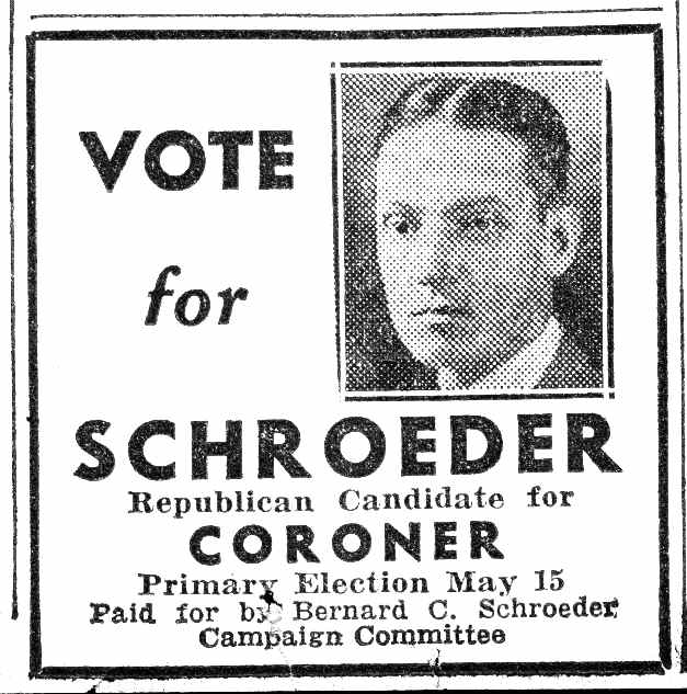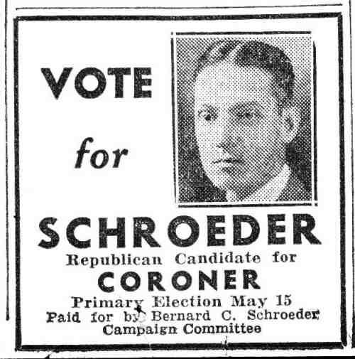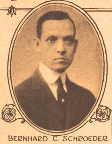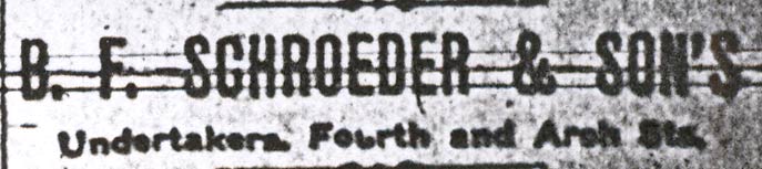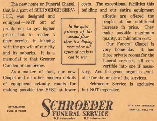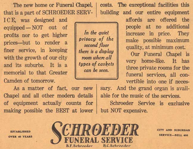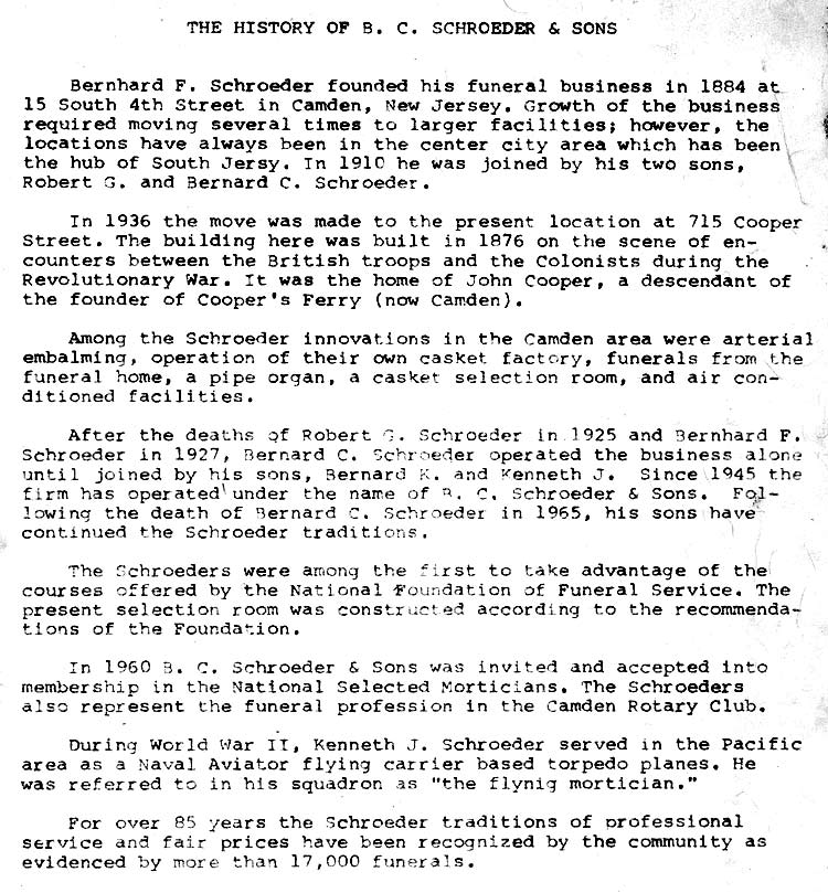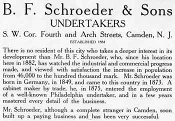 BERNARD C. SCHROEDER was born Bernhard C. Schroeder in Camden NJ on April 13, 1892. He was the second son, coming after brother Robert Schroeder. Bernard Schroeder later adopted the more common spelling of his first name. His father, Bernhard F. Schroeder had established an undertaking business at 19 South 4th Street in 1884, which later moved to 336-338 Arch Street. Bernard C. Schroeder followed in his father's and brother's footsteps, and at the time of the 1920 Census was active in running the family business. Sadly, brother Robert died in 1925. Bernard C. Schroeder took the reins of the family business, and in the following year moved the business to 538 Broadway, the Labor Temple building, at Broadway and Line Street. Bernhard F. Schroeder passed away the following year. In 1936 the business was once again moved, to 715 Cooper Street, where the Schroeder Funeral Home remained through the fall of 1969.. Bernard C. Schroeder married, and at least two sons were born to his wife Charlotte S. "Lottie" Schroeder; Bernard K., in 1916, and Kenneth J. in 1920. After his father's death in 1927, Bernard C. Schroeder carried on the family business. Bernard C. Schroeder passed away in December of 1965, and was buried at Harleigh Cemetery, survived by his wife and sons Kenneth J. Schroeder and Bernard K. Schroeder.. |
