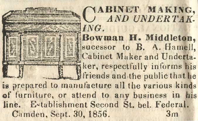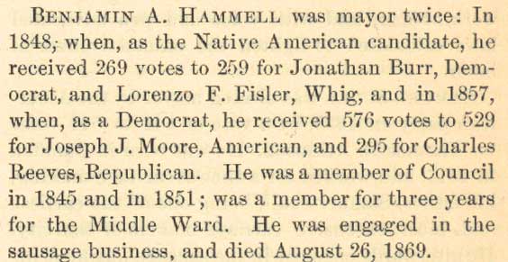 BENJAMIN A. HAMMELL was involved for many years in Camden's political life. He was elected mayor twice, in 1848 when he succeeded Thomas B. Wood, and in 1857, when he succeeded James W. Shroff as mayor. Benjamin Hammell also served on City Council. During his administration, the land on Broadway between Federal and Market Streets, upon which the Camden County Courthouse stood for so many years, and upon which a County office building sits today, was purchased for $500 from Abigail Cooper. Benjamin A. Hammell was in the cabinet making and undertaking business when the census was taken in 1850. He was then living with his wife Hannah and their children, Alexander, Charles, David, Benjamin, and Caroline. By 1857 he had sold that business to Bowman H. Middleton Sr. and gone into the sausage making business. He lived at 612 Federal Street in the years after the Civil War. Benjamin A. Hammell passed away on August 26, 1869. |