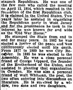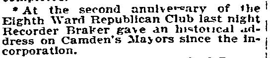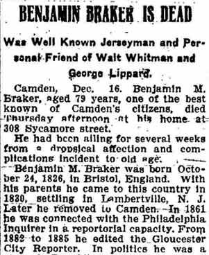 BENJAMIN BRAKER was a well known figure in South Jersey for over 50 years, until his passing in December 1905 as a journalist and politician. He was a close personal friend of George Lippard, founder of the Brotherhood of the Union, and of the famed poet, Walt Whitman. In the late 1880s and early 1890s he lived at 255 Kaighn Avenue, and engaged in real estate and other pursuits. Born in Bristol, England in 1826, he came to America in 1830. During the Civil War, Benjamin Braker answered his nations call. He enlisted as a private in Company E, 20th Pennsylvania Emergency Regiment on June 17, 1863 in Philadelphia. This unit was one of several raised in response to the Confederate advance into Pennsylvania, which culminated in the Battle of Gettysburg, July 2 through July 4, 1863. The unit mustered out on August 10th. Benjamin Braker again enlisted as a private on July 14, 1864 in Company A, 1st Militia Infantry Regiment New Jersey in Camden. This unit was called to service as an emergency response to the Confederate offensive in Maryland. In the early part of July, 1864, the cities of Washington, D. C., and Baltimore, Md., were endangered by a threatened invasion of the enemy. A battle had been fought within a few miles of Baltimore and communication with Washington had been interrupted. In view of this emergency the governor of New Jersey issued a proclamation dated at Trenton, July 12, 1864, calling for the organization of the militia for 30-days' service in Pennsylvania, Maryland or the District of Columbia. Under the call this company reported for duty, was accepted, and mustered in at Camden N. J., July 14, 1864, for 30 days. It left the state on July 15 for Baltimore, Md., and on arrival reported to Major General Lew Wallace, commanding the Middle Department. It was stationed at the Relay house, below Baltimore, and was attached to the 1st Separate Brigade, 8th Army Corps. Upon expiration of term of service it returned to New Jersey, and was mustered out at Camden, Aug. 15, 1864. Active politically, Benjamin Braker was one of the founders of the Republican Party in New Jersey. He was elected Justice of the Peace in Camden and served continuously until his death. He was elected City Recorder four times between 1877 and 1889, and also served as a state Assemblyman in the 1880s. Benjamin Braker passed away at his home, at 308 Sycamore Street, Camden on December 14, 1905, survived by his wife, two daughters, and two sons. Daughter Laura Braker had married John Dodd Courter. Both John Dodd Courter and his son Benjamin W. Courter had long and succesful careers as reporters and columnists in Camden. |