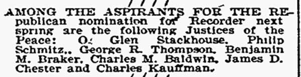 F. Wolfe Isaac Toone - John H. Fort - Philip Schmitz - O. Glen Stackhouse - Charles M. Baldwin George R. Thompson - Frederick Kauffman - Benjamin Braker - David M. Chambers William H. Davis - Dr. John W. Donges - Harry B. Paul |